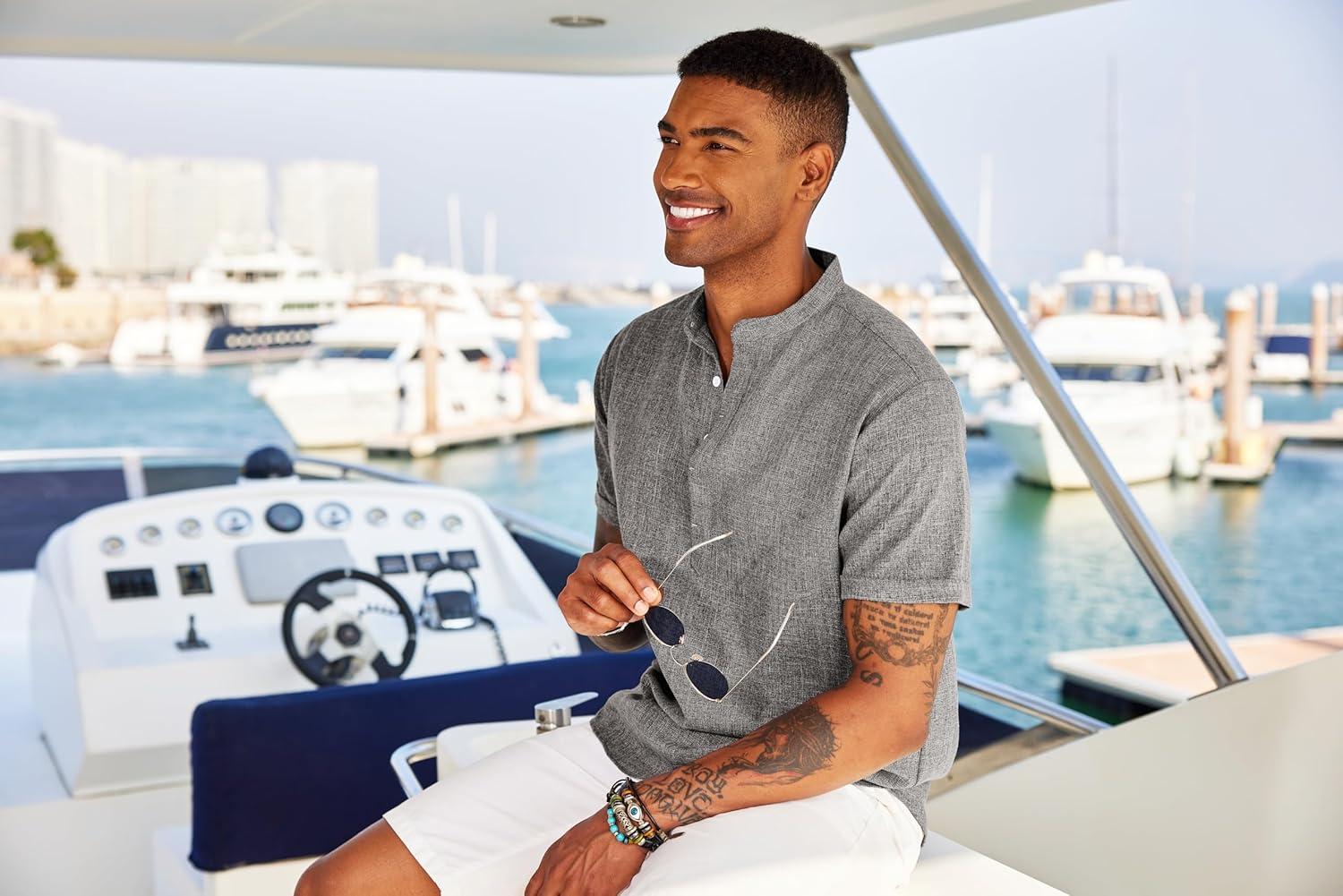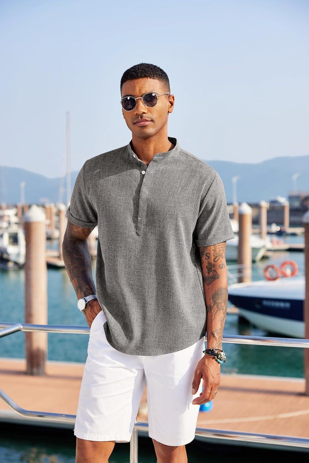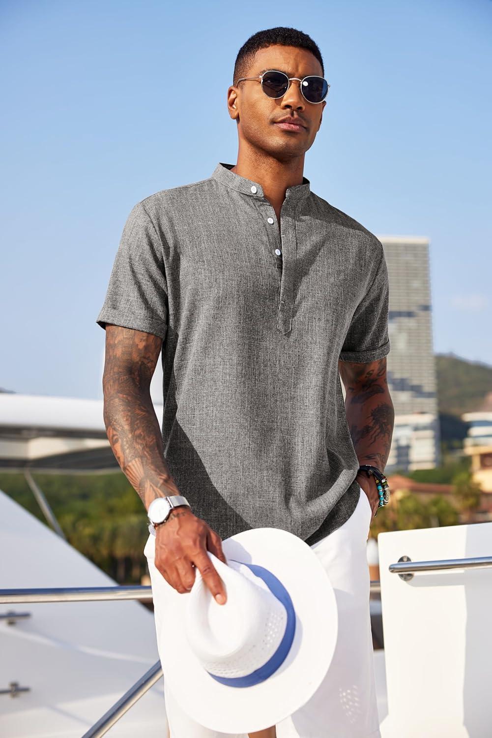 COOFANDY Men’s Linen Henley Shirt Short Sleeve Casual Summer Beach Hippie T Shirts(Dark Grey)
