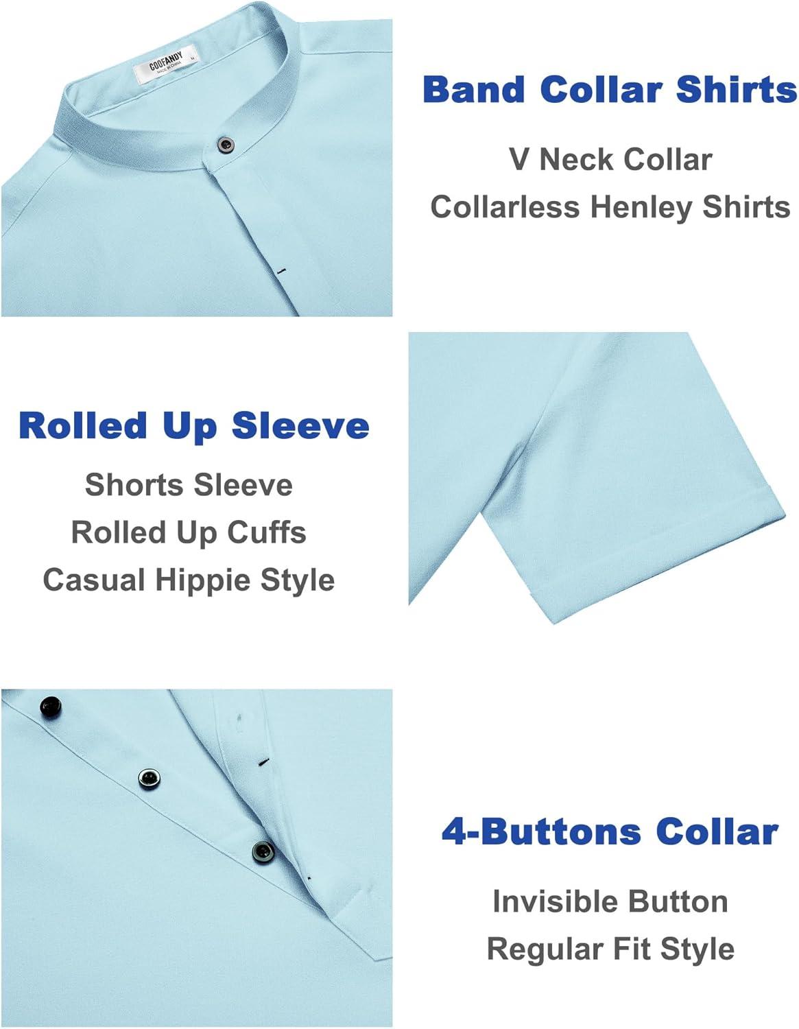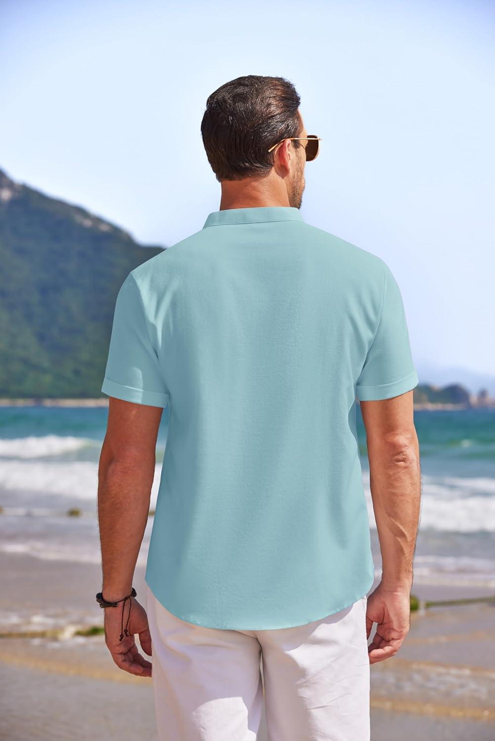 COOFANDY Men's Linen Henley Shirt Short Sleeve Casual Summer Beach Hippie T Shirts(Ice Blue)