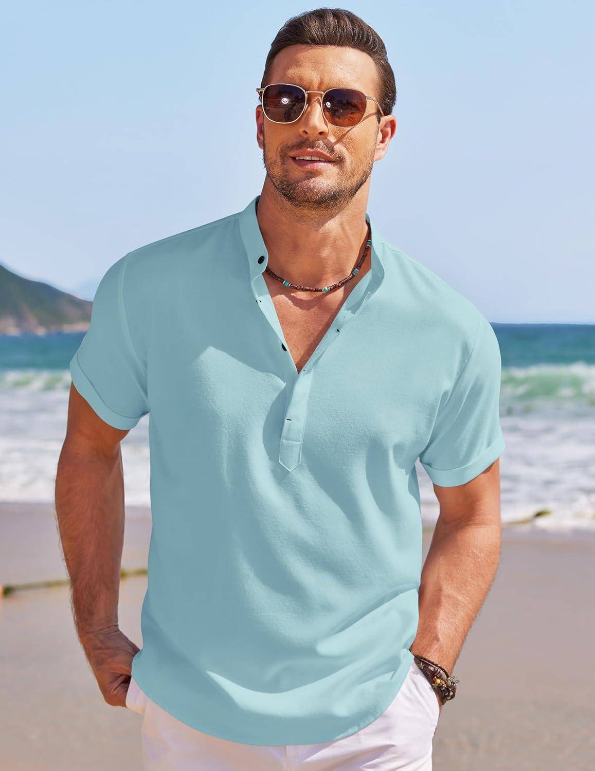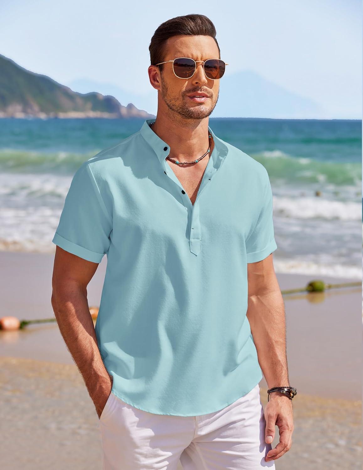 COOFANDY Men’s Linen Henley Shirt Short Sleeve Casual Summer Beach Hippie T Shirts(Ice Blue)