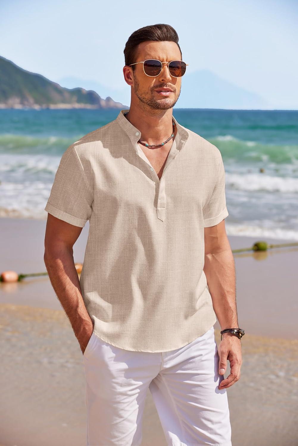 COOFANDY Men’s Linen Henley Shirt Short Sleeve Casual Summer Beach Hippie T Shirts(Khaki)