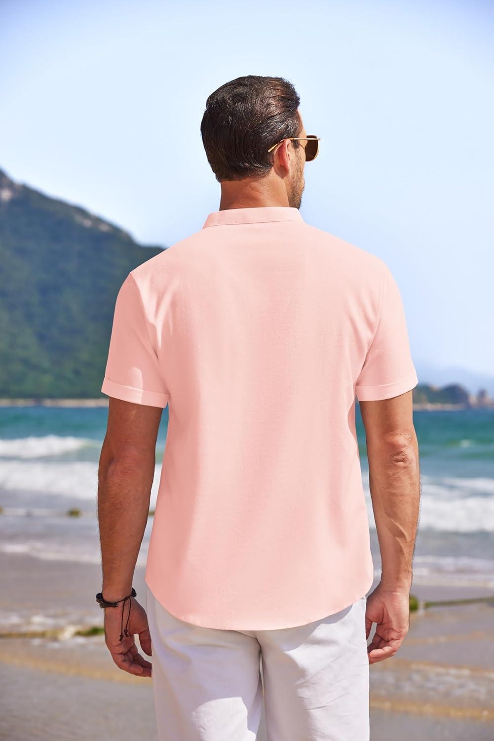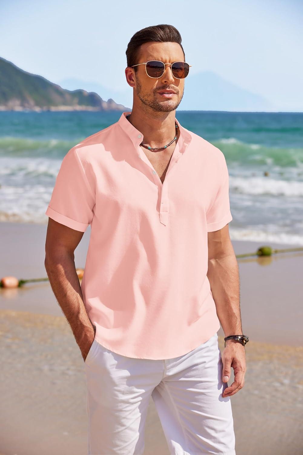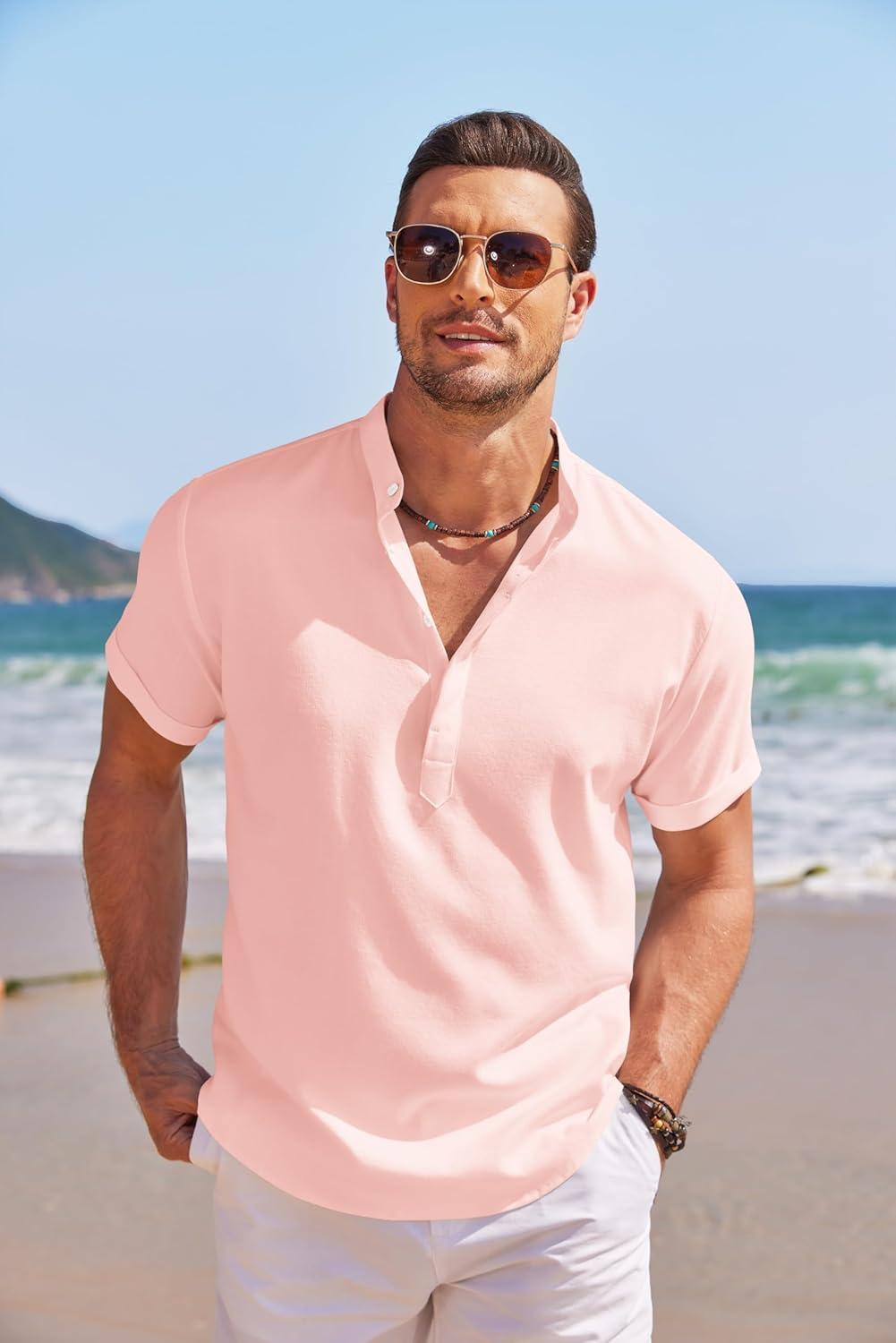 COOFANDY Men’s Linen Henley Shirt Short Sleeve Casual Summer Beach Hippie T Shirts(Pink)