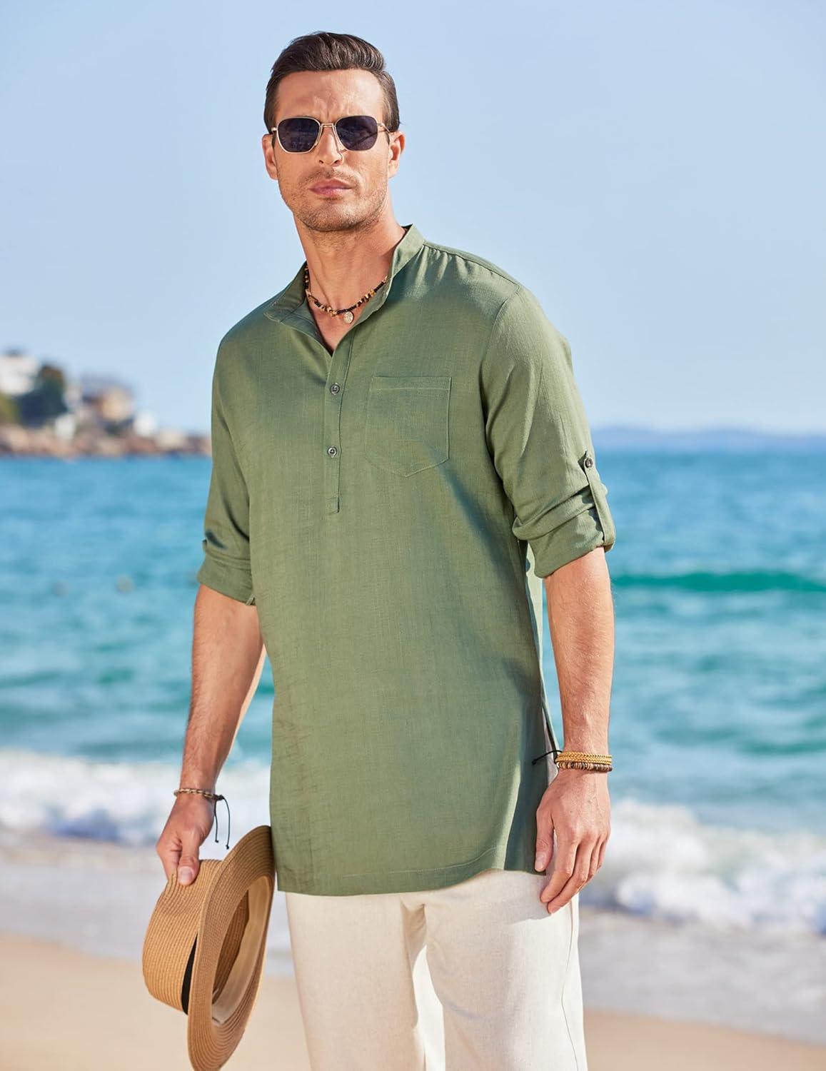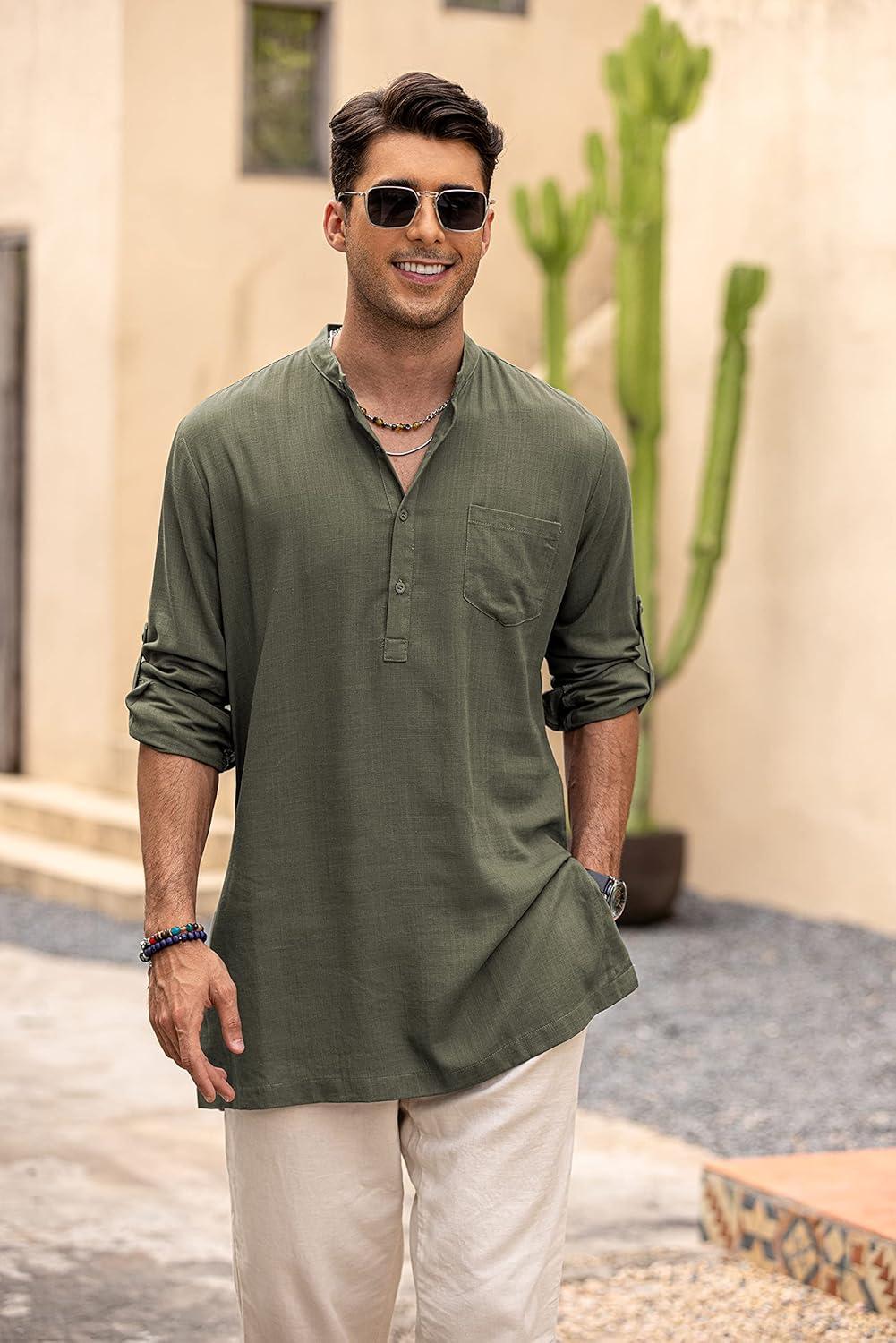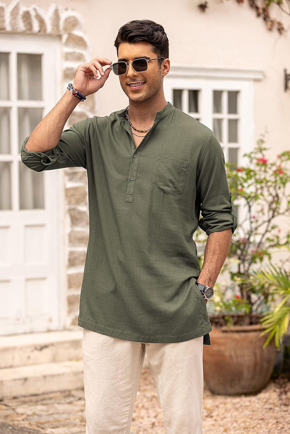 COOFANDY Men’s Linen Henley Shirts Long Sleeve Collarless T-Shirts Longline Kurta Beach Shirts with Pocket(Army Green)