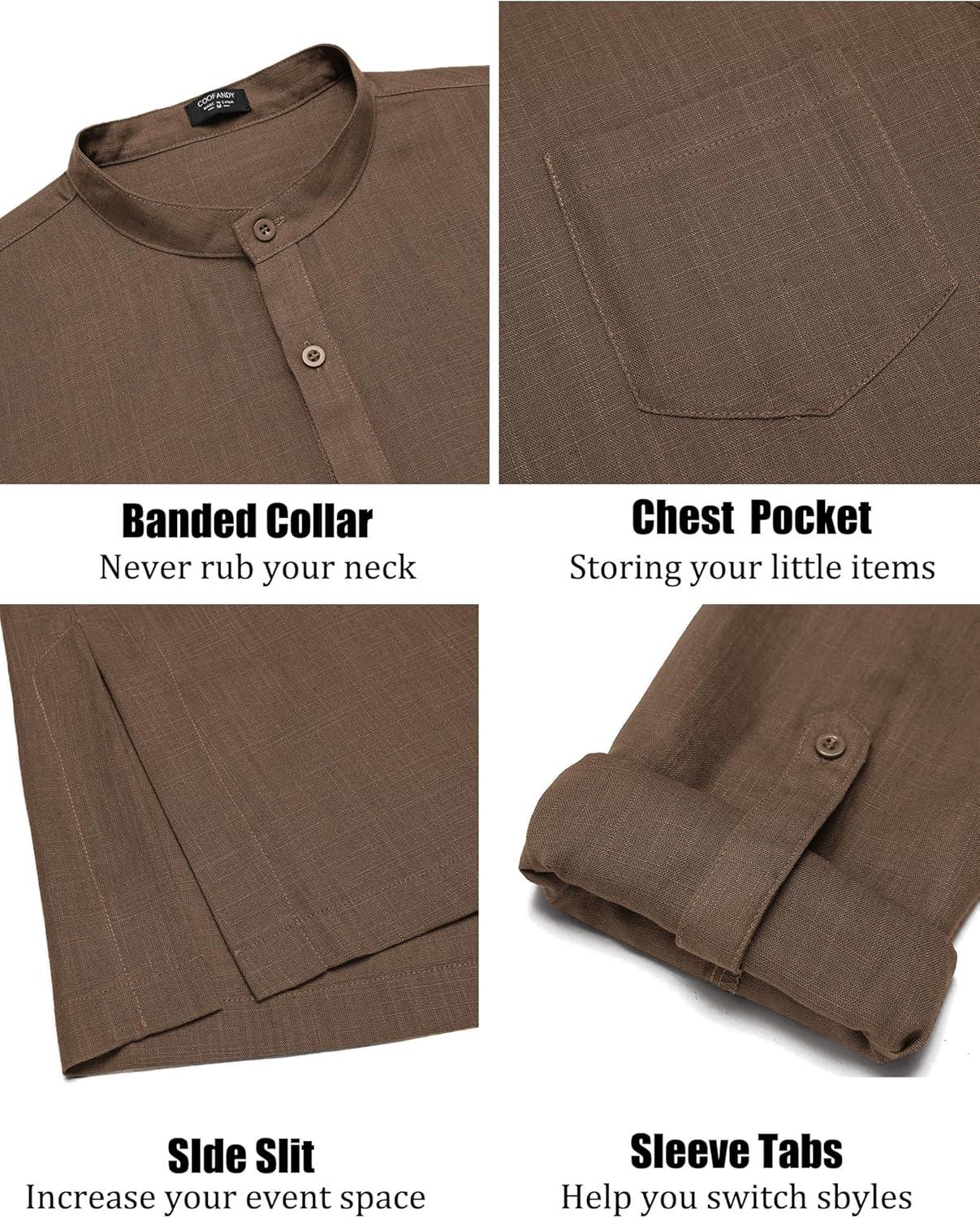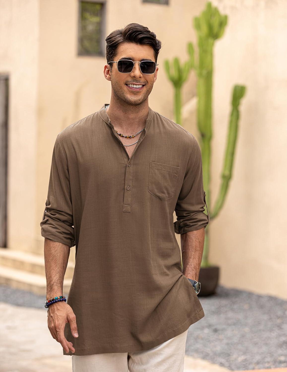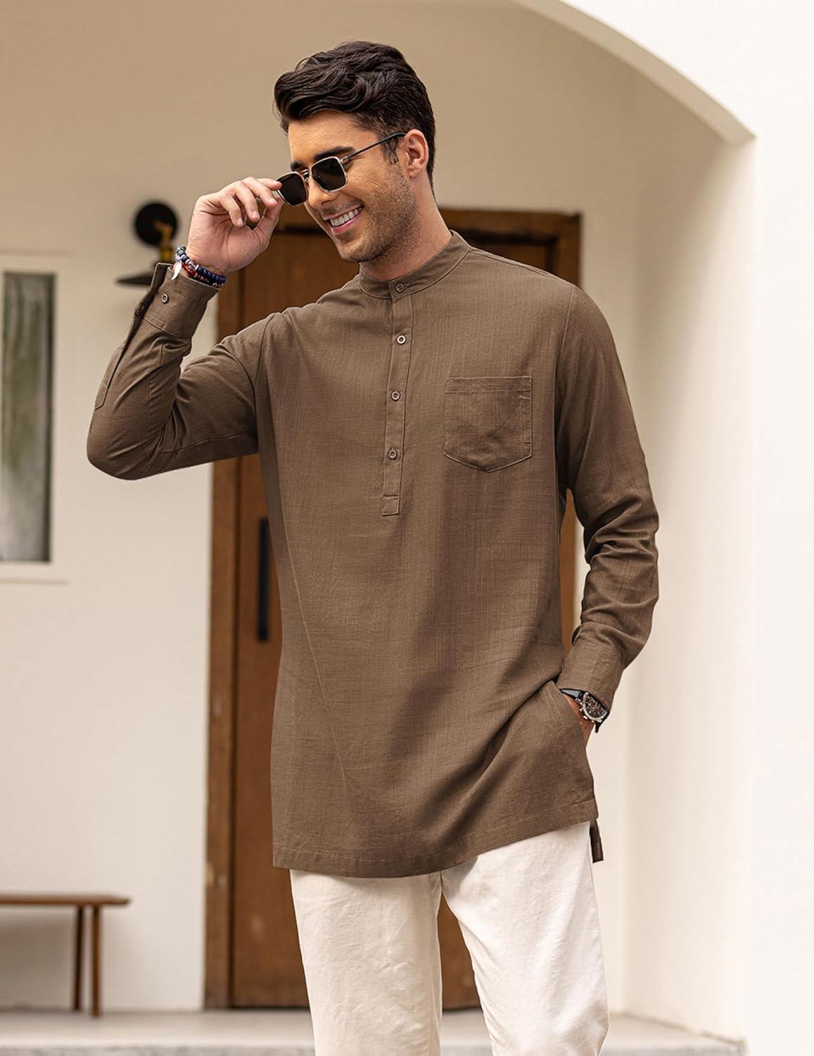 COOFANDY Men’s Linen Henley Shirts Long Sleeve Collarless T-Shirts Longline Kurta Beach Shirts with Pocket(Brown)