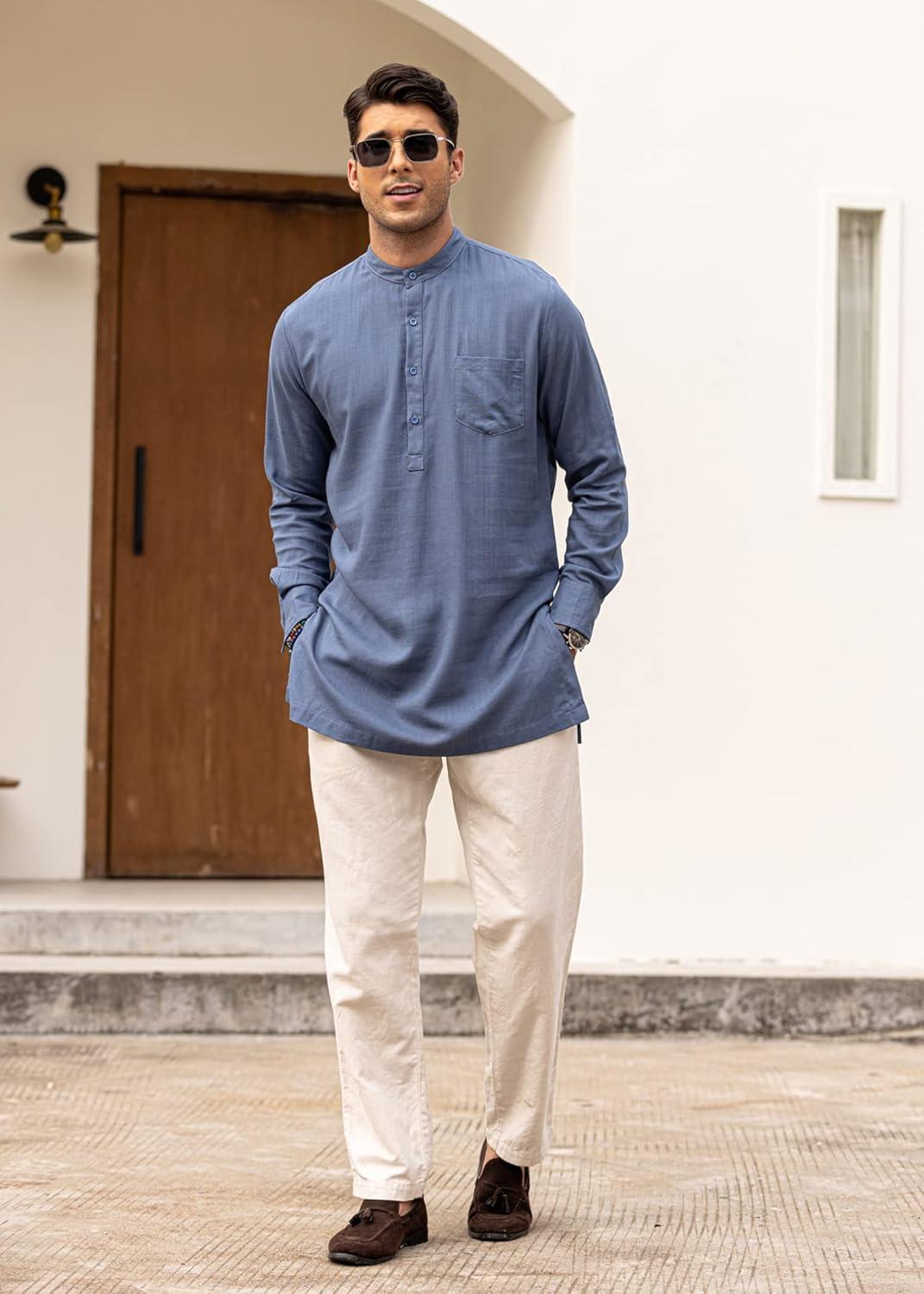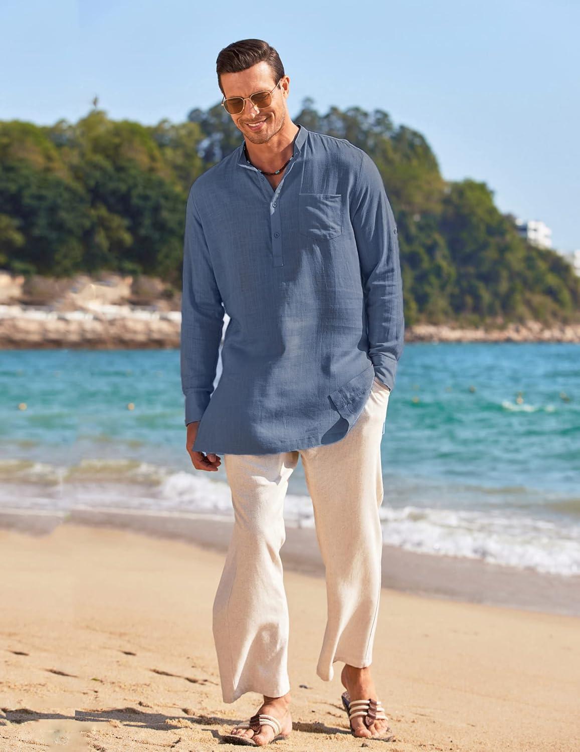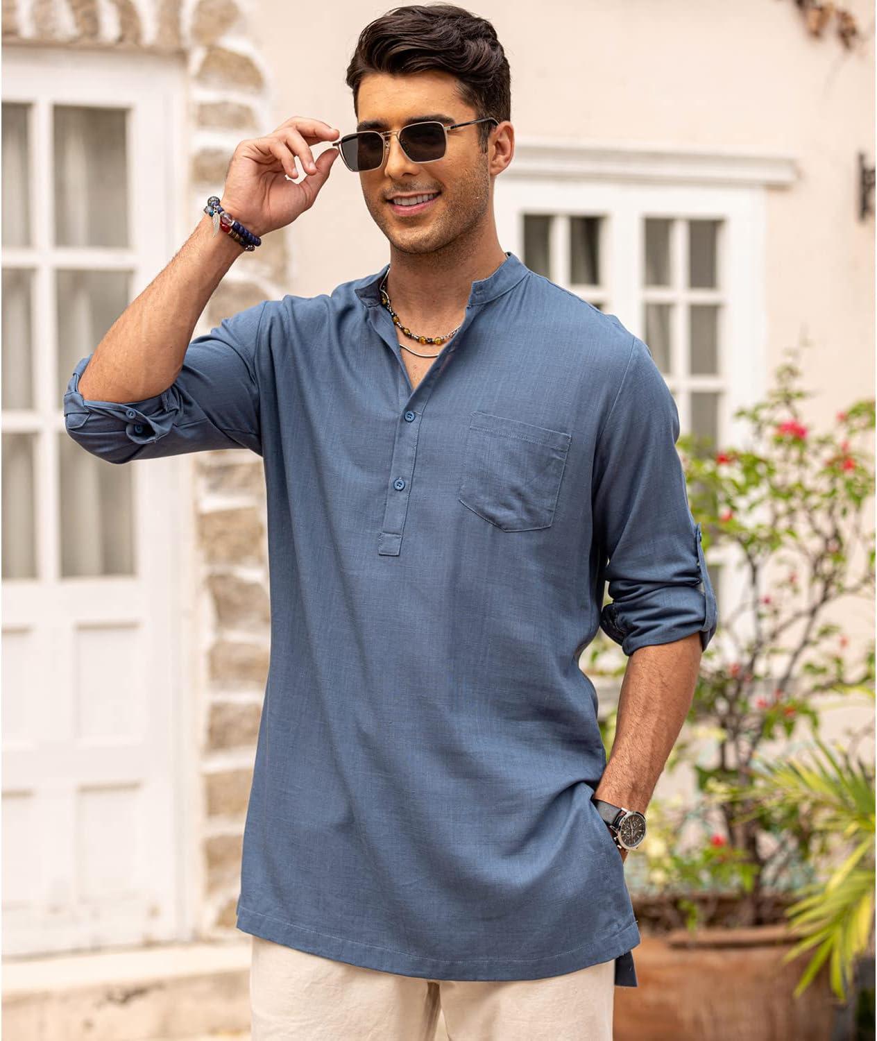 COOFANDY Men’s Linen Henley Shirts Long Sleeve Collarless T-Shirts Longline Kurta Beach Shirts with Pocket(Light Blue)