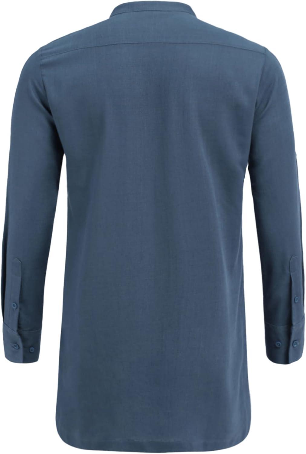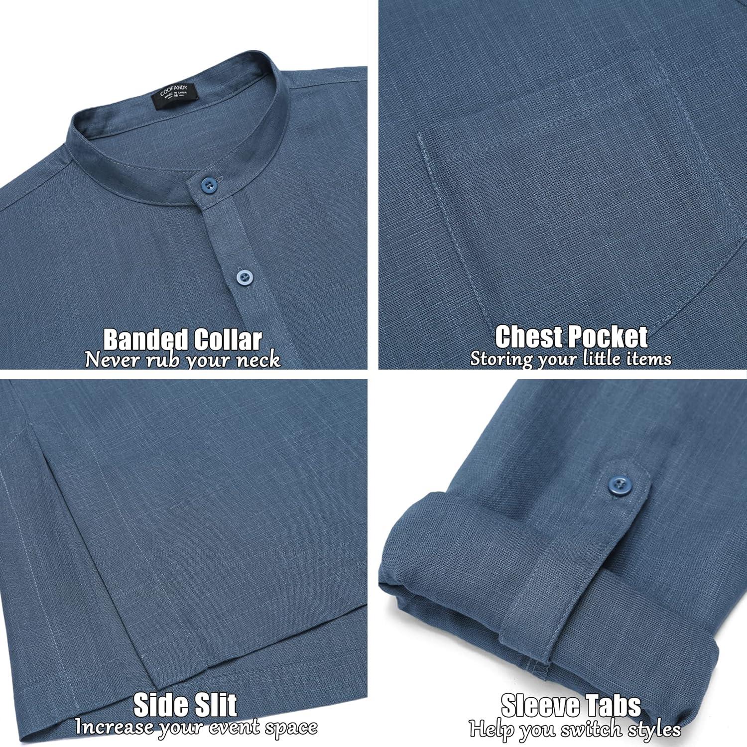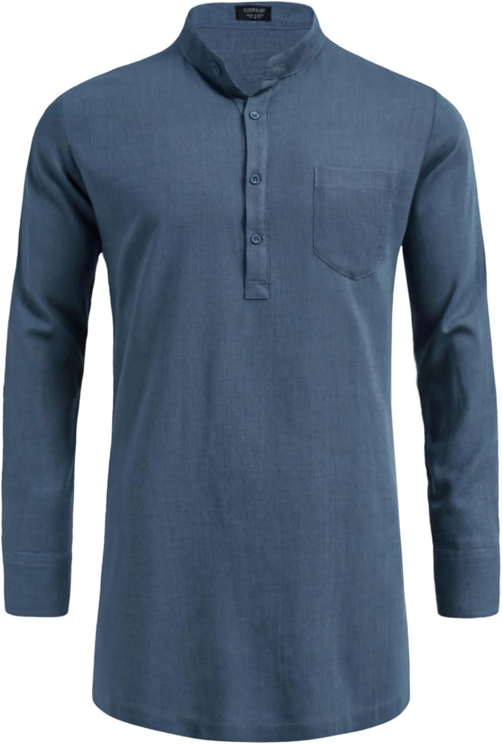 COOFANDY Men’s Linen Henley Shirts Long Sleeve Collarless T-Shirts Longline Kurta Beach Shirts with Pocket(Dark Blue)