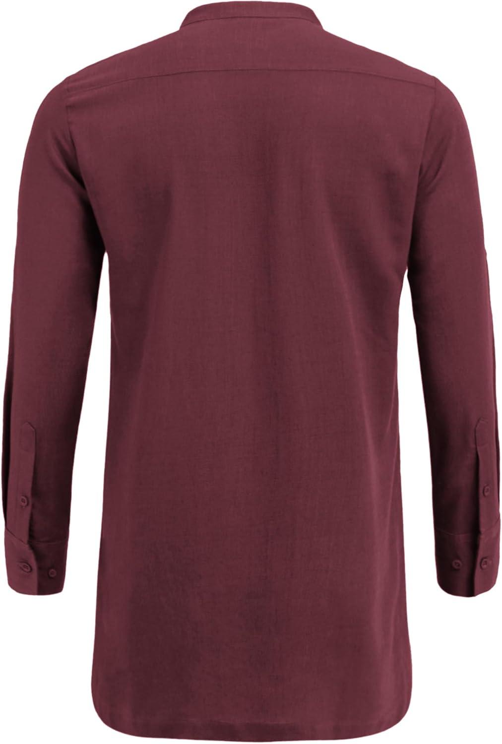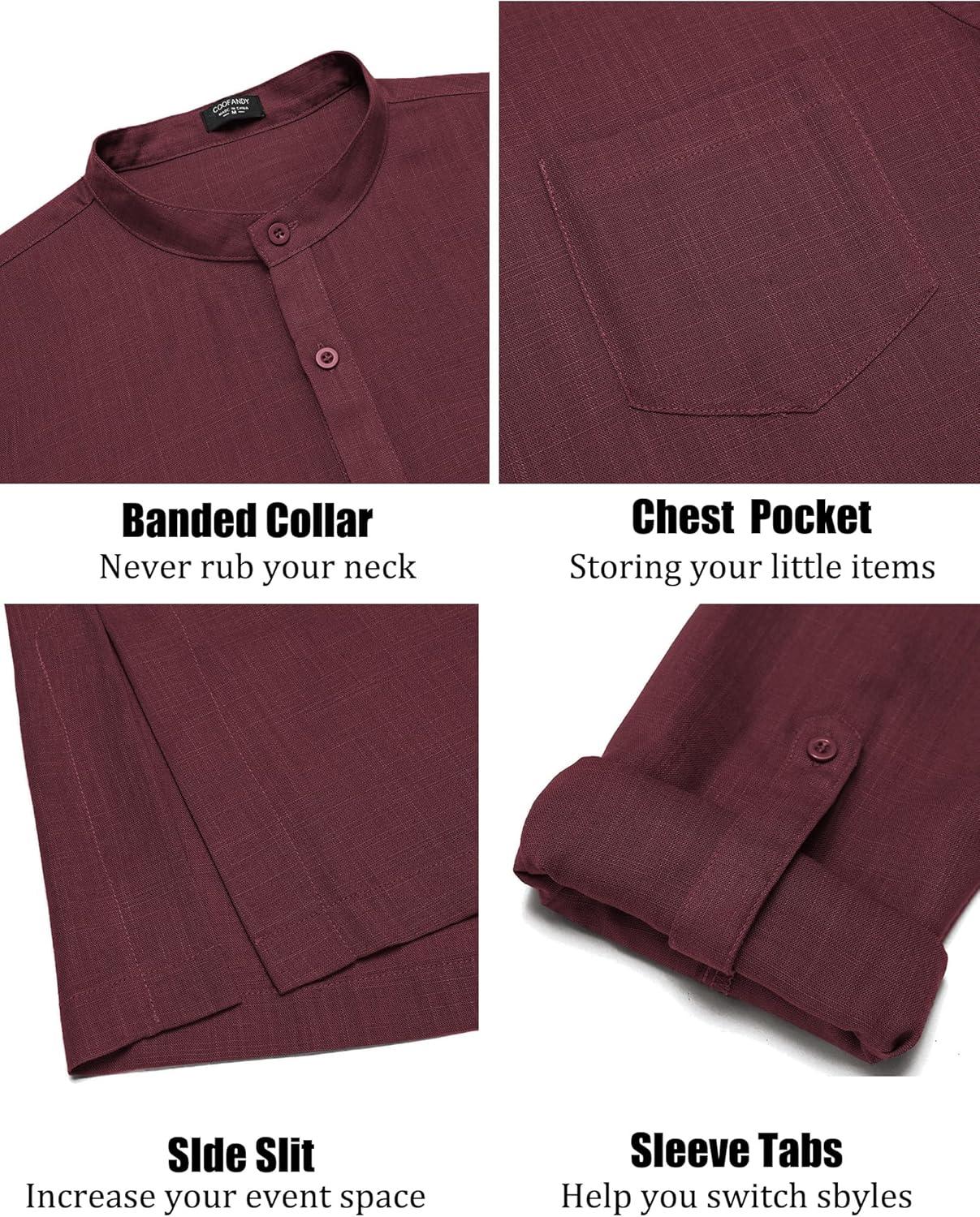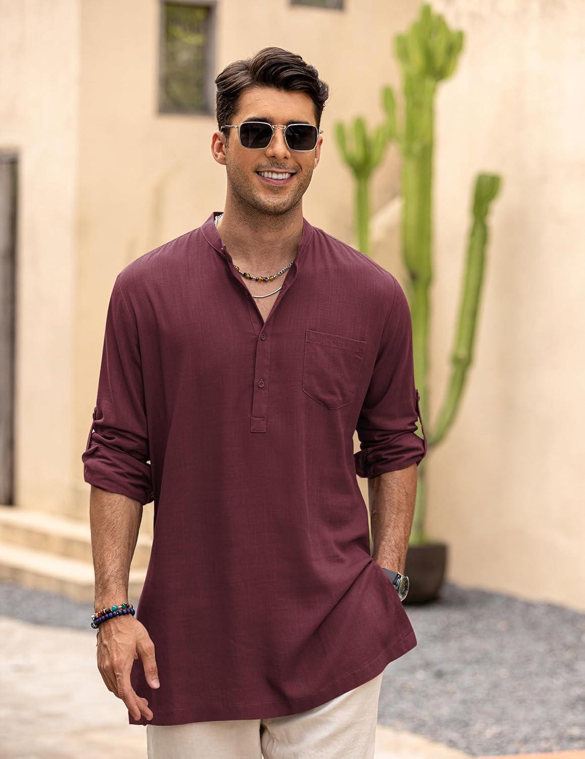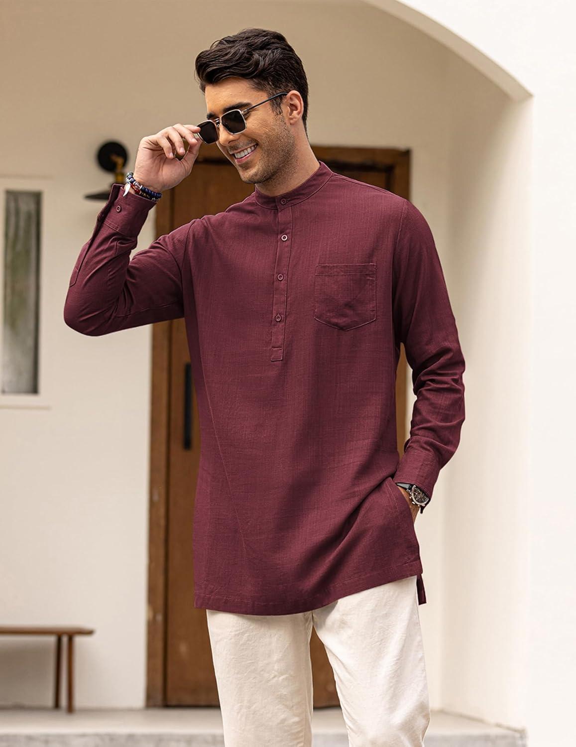 COOFANDY Men’s Linen Henley Shirts Long Sleeve Collarless T-Shirts Longline Kurta Beach Shirts with Pocket(Wine Red)