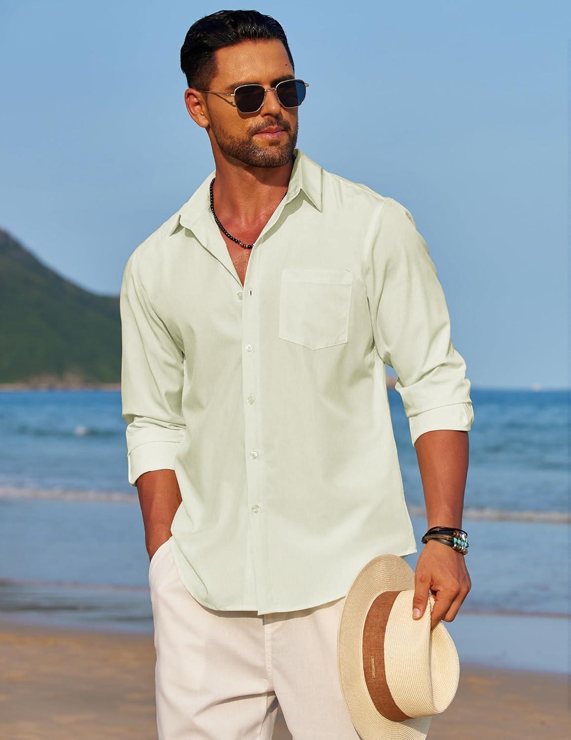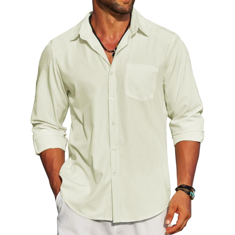 COOFANDY Men’s Linen Long Sleeve Shirts Casual Button Down Untucked Shirt Vacation Wedding Shirts with Pocket(Cream)