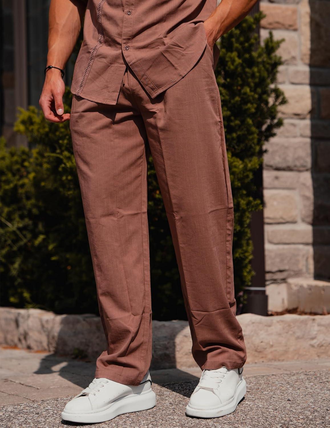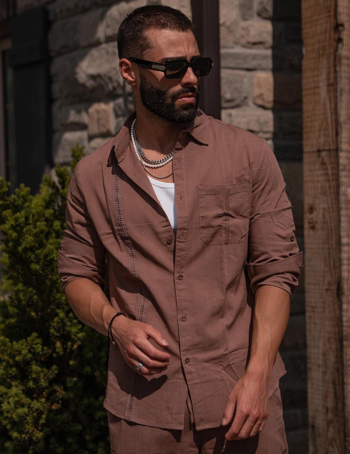 COOFANDY Mens Linen Sets 2 Piece Long Sleeve Button Down Cuban Shirt and Pants Set Summer Beach Set Outfits(Brown)