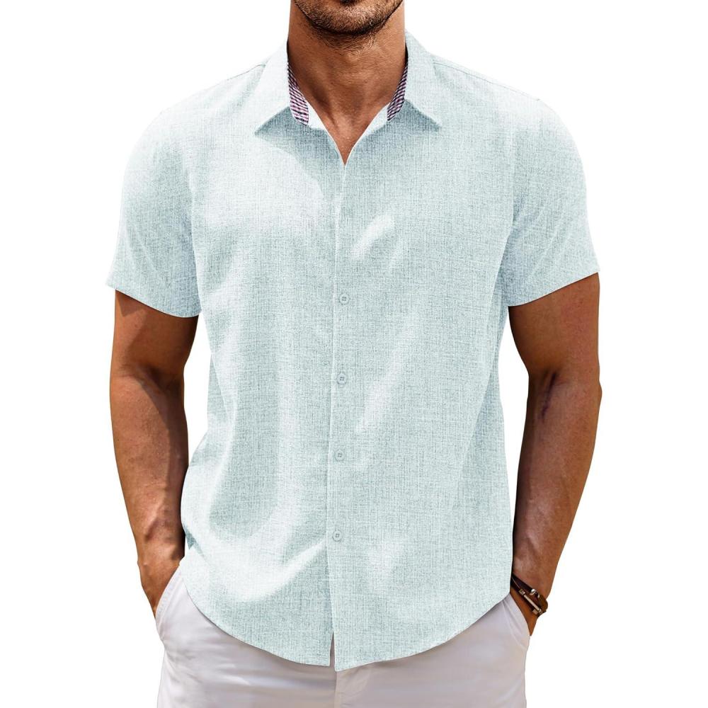 COOFANDY Mens Linen Shirt Casual Short Sleeve Button Down Shirts Summer Beach Vacation Tops(Light Blue)