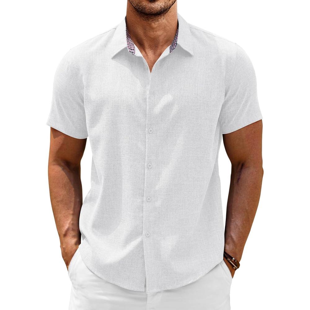 COOFANDY Mens Linen Shirt Casual Short Sleeve Button Down Shirts Summer Beach Vacation Tops(White)