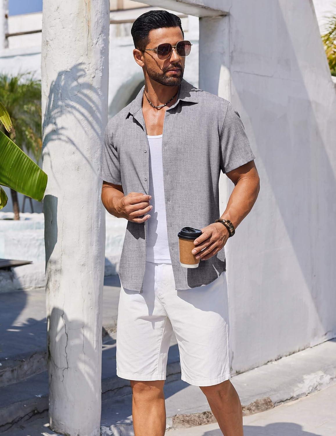 COOFANDY Men's Linen Shirts Short Sleeve Button Down Shirt Casual Beach Summer Shirts Wedding Vacation Shirt(Light Grey)