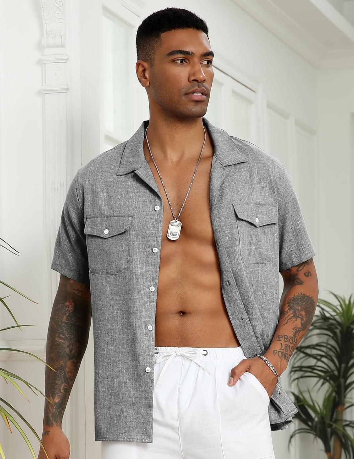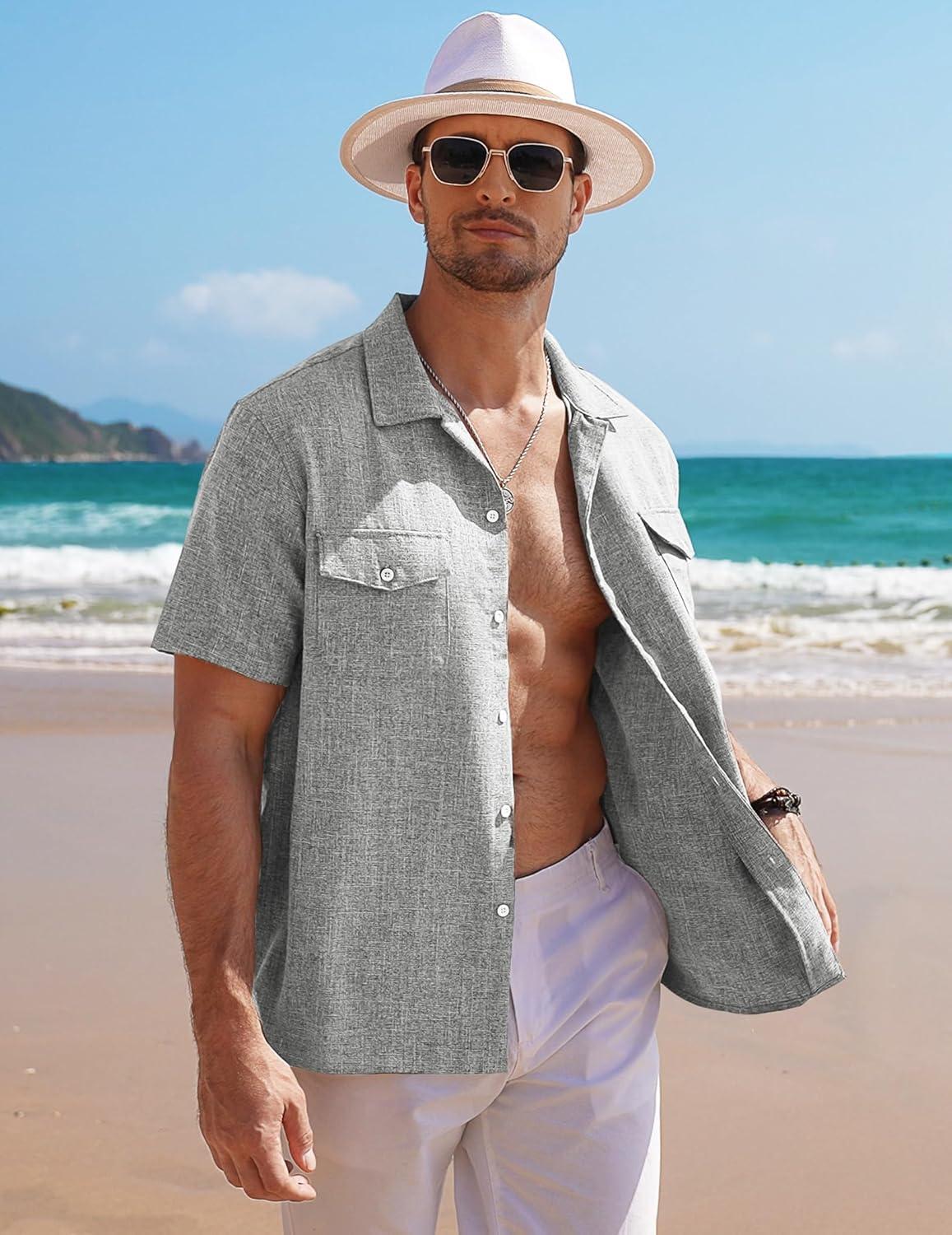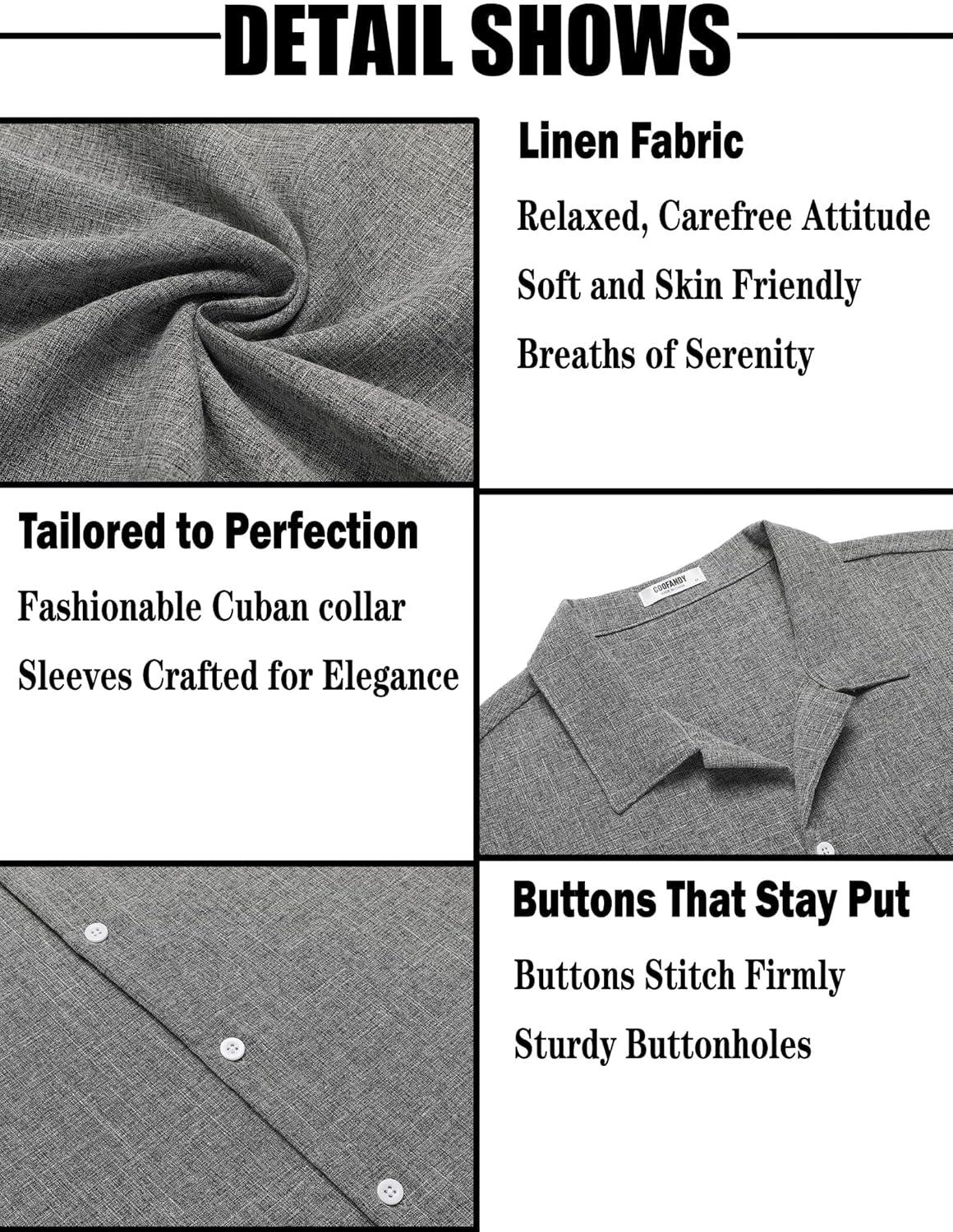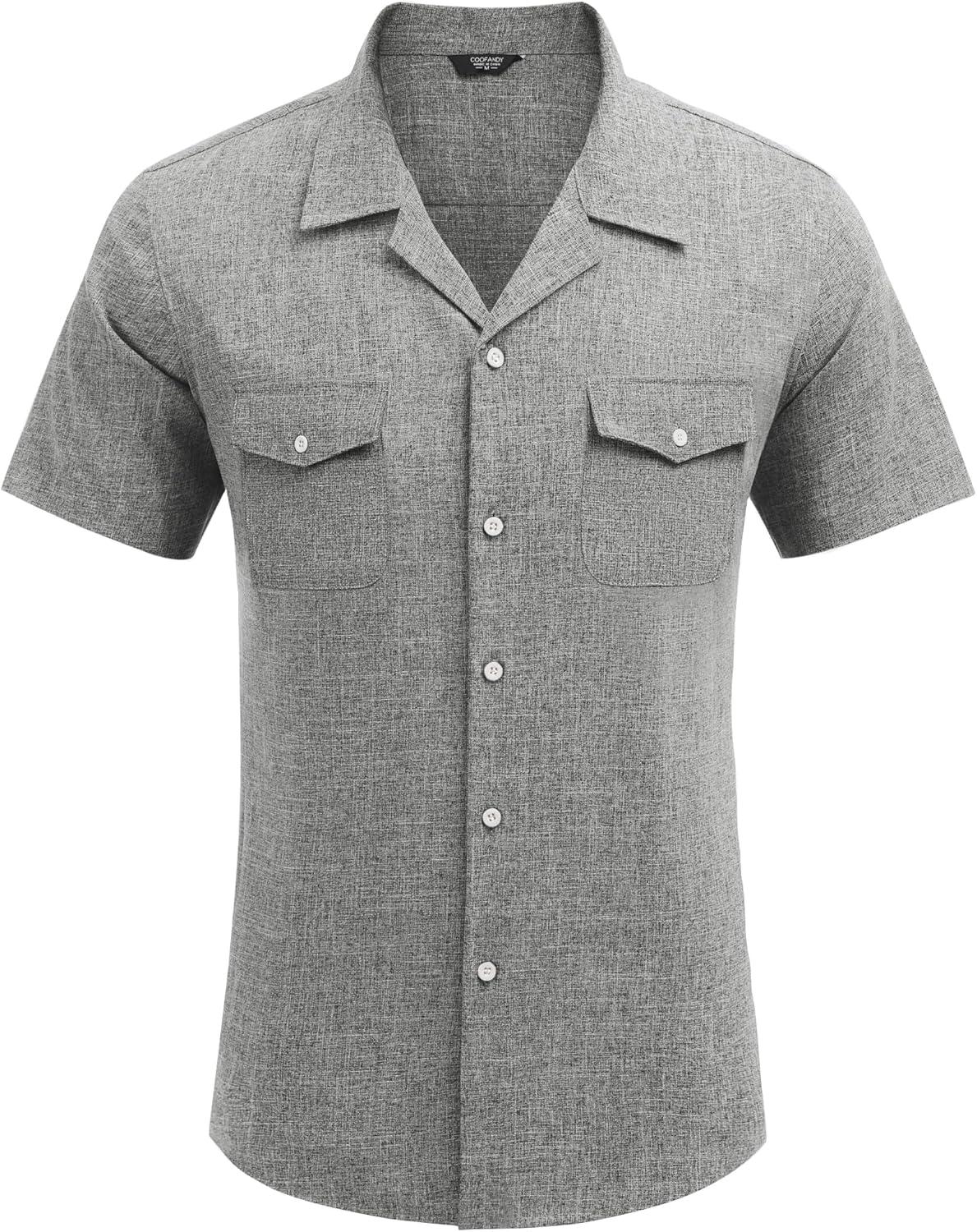 COOFANDY Men’s Linen Short Sleeve Button Down Shirt Casual Cuban Collar Summer Beach Shirts Vacation Essentials(Light Grey)