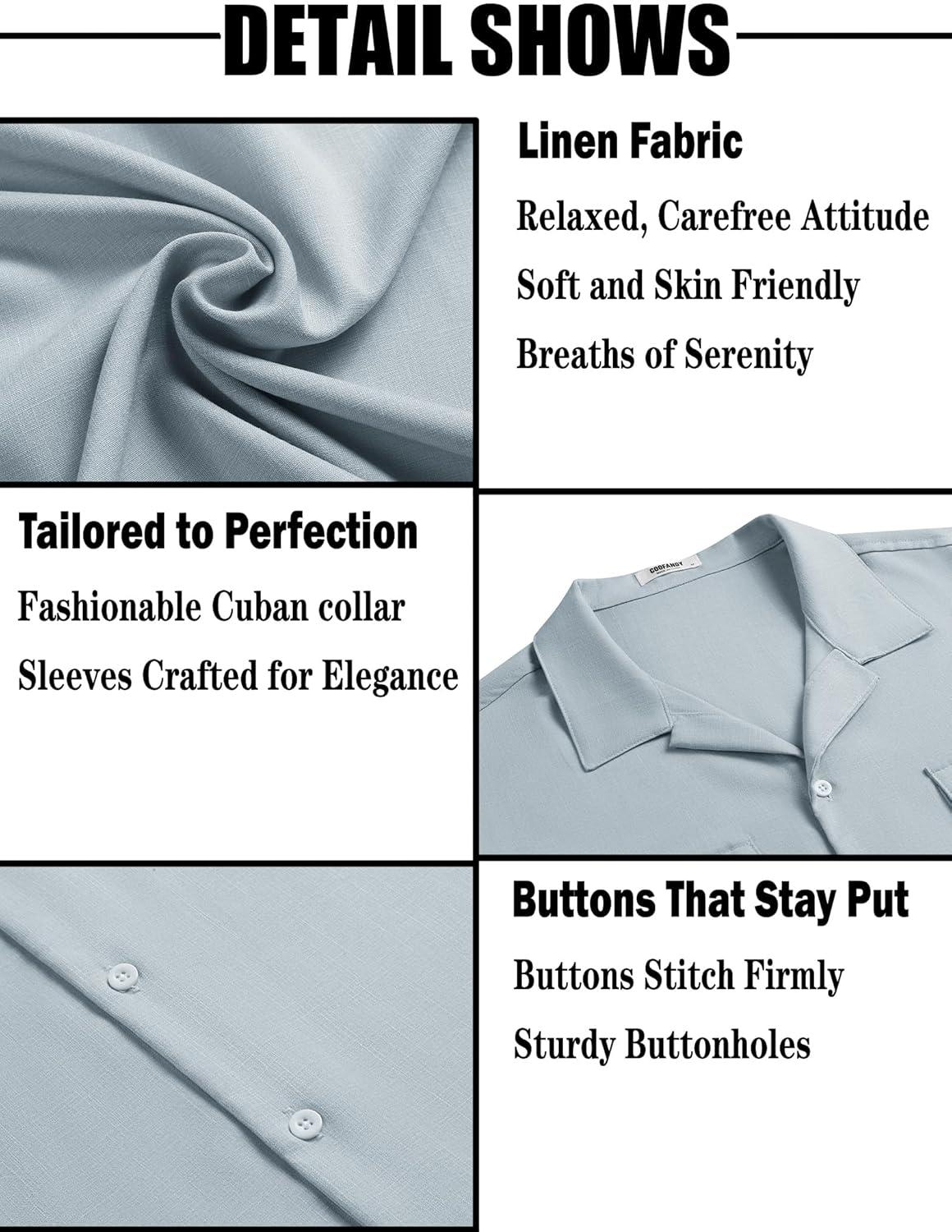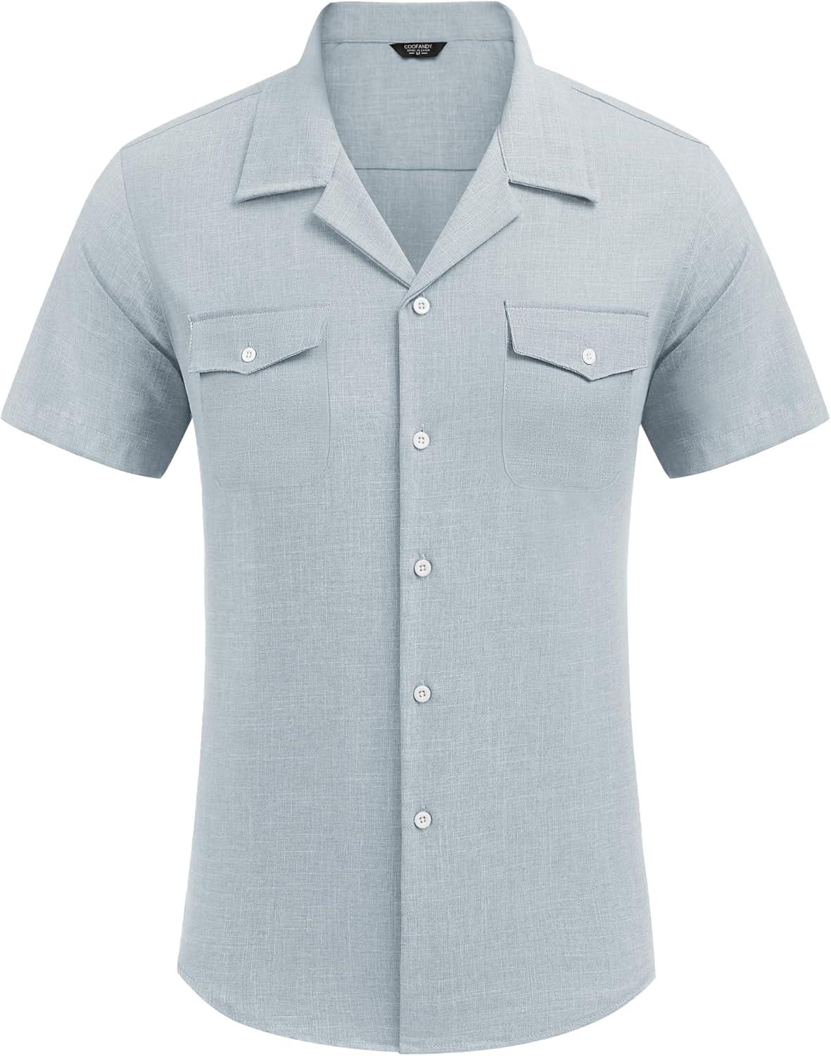 COOFANDY Men's Linen Short Sleeve Button Down Shirt Casual Cuban Collar Summer Beach Shirts Vacation Essentials(Pale Blue)