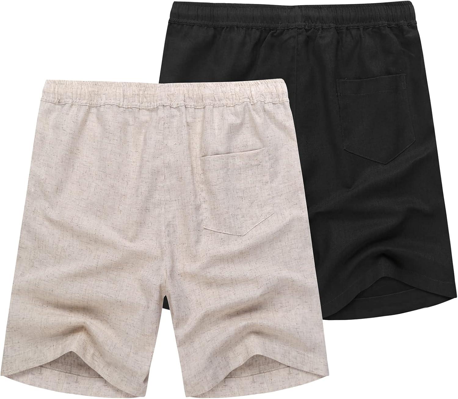 COOFANDY Men’s Linen Shorts Casual Elastic Waist Drawstring Summer Beach Shorts(2 Black/ Khaki)