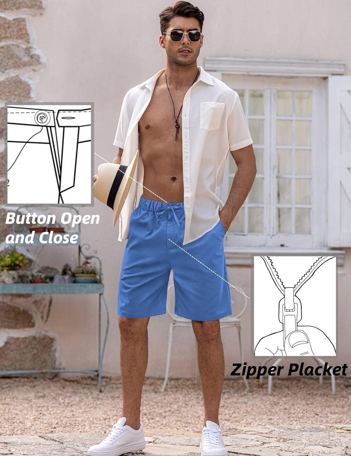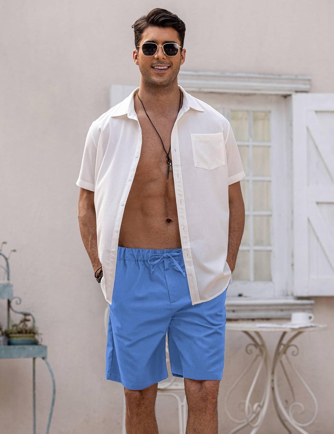 COOFANDY Mens Linen Shorts Elastic Waist Drawstring Casual Summer Beach Shorts(A-light Blue/Navy Blue)