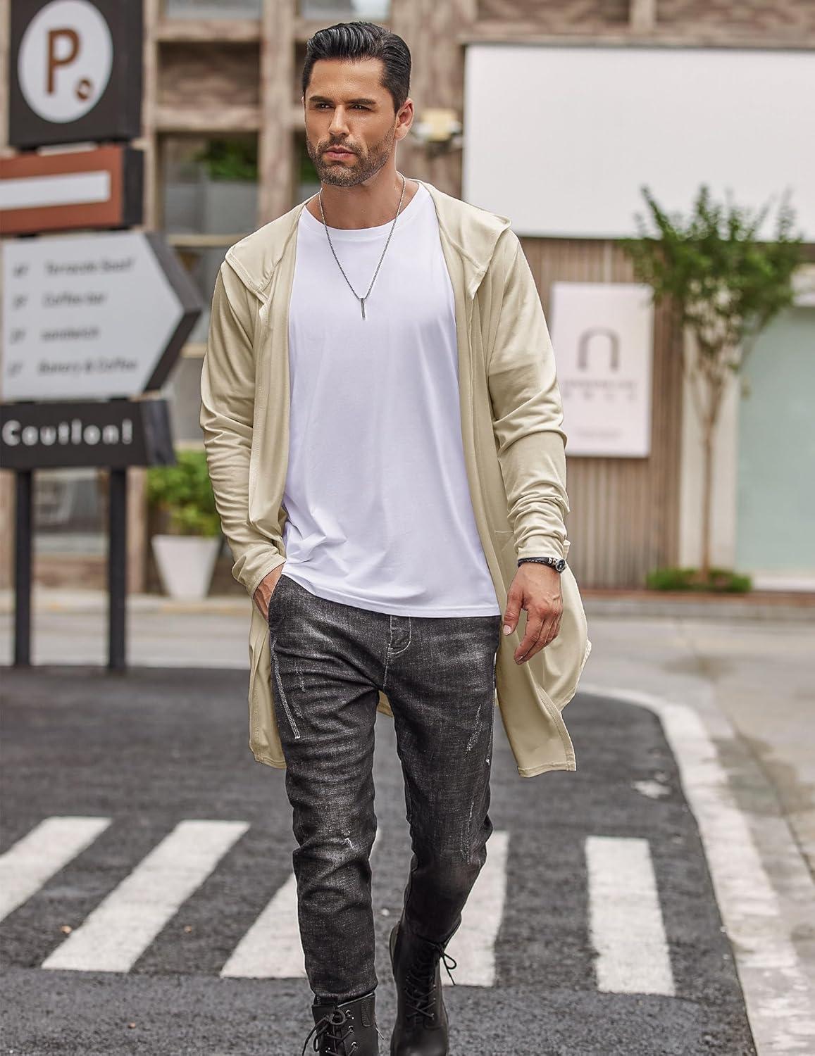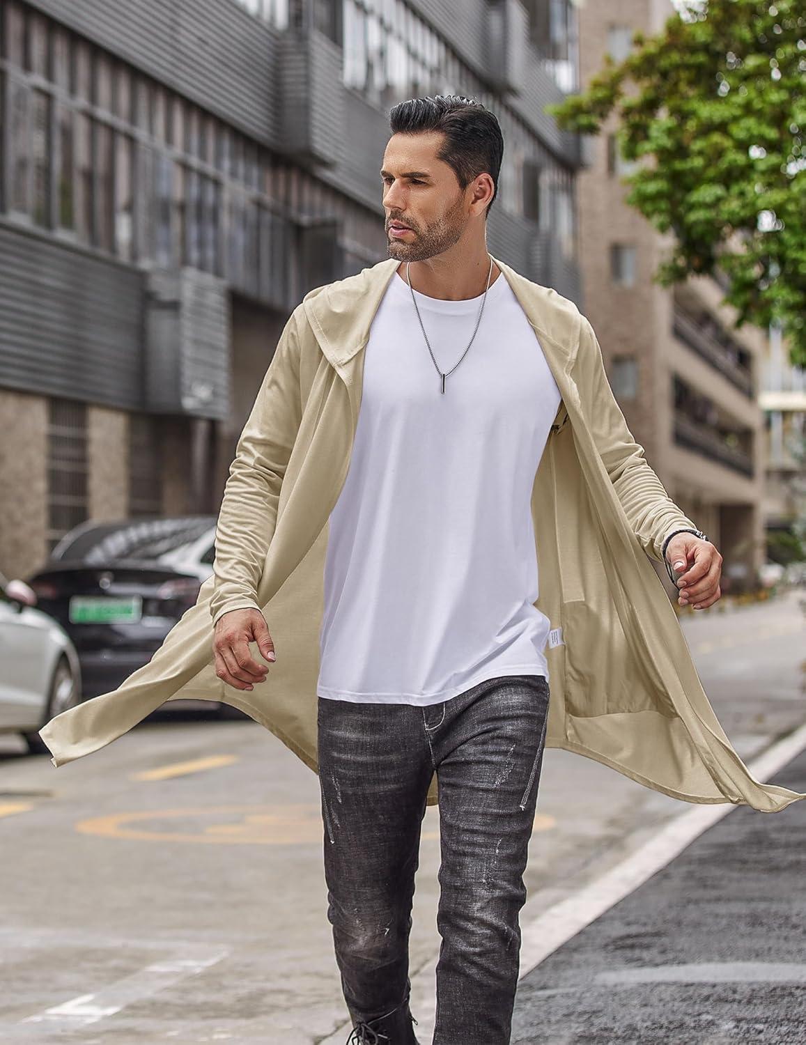COOFANDY Men’s Long Hooded Cardigan Shawl Collar Lightweight Open Front Drape Cape Overcoat with Pockets(Light Grey)