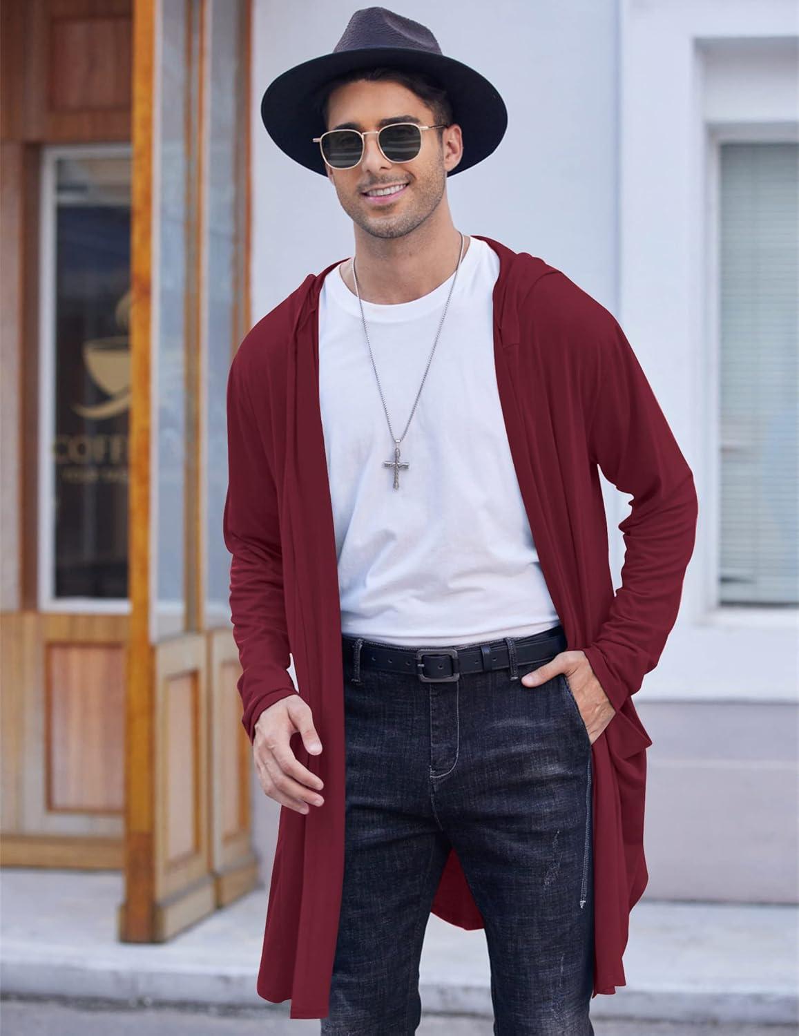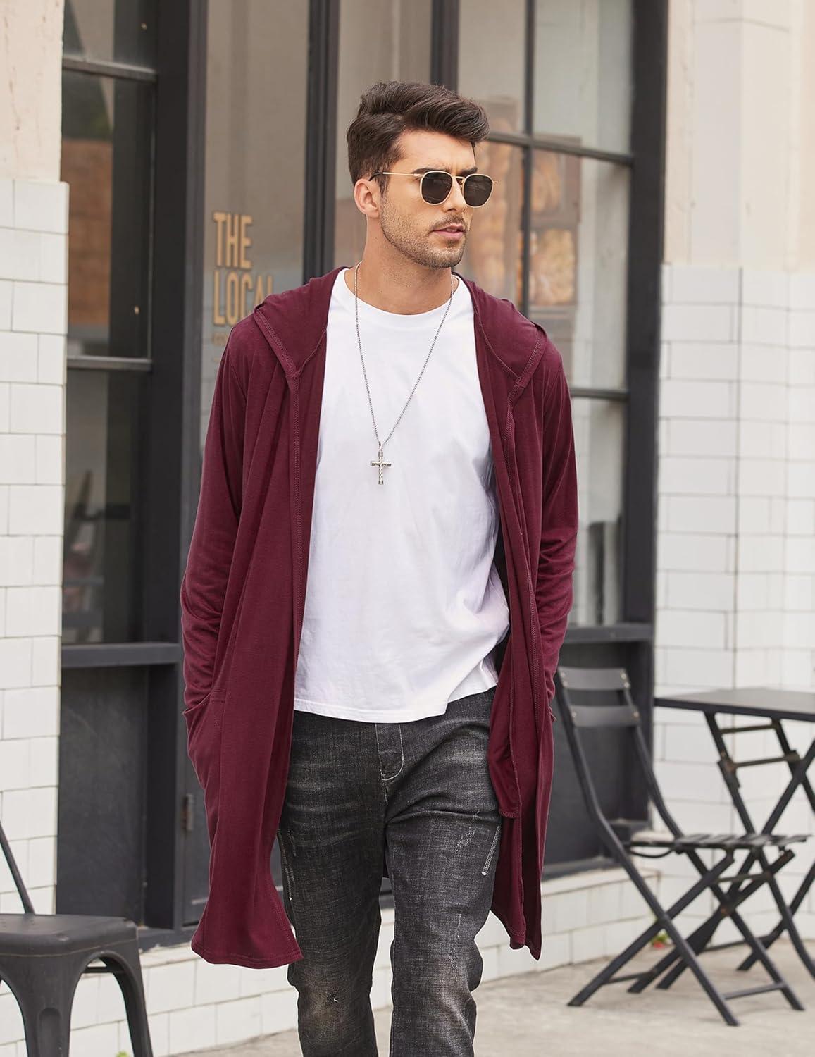 Get up to 70% off on COOFANDY Men’s Long Hooded Cardigan Shawl Collar Lightweight Open Front Drape Cape Overcoat with Pockets(Wine Red) styles during our end-of-season clearance event.