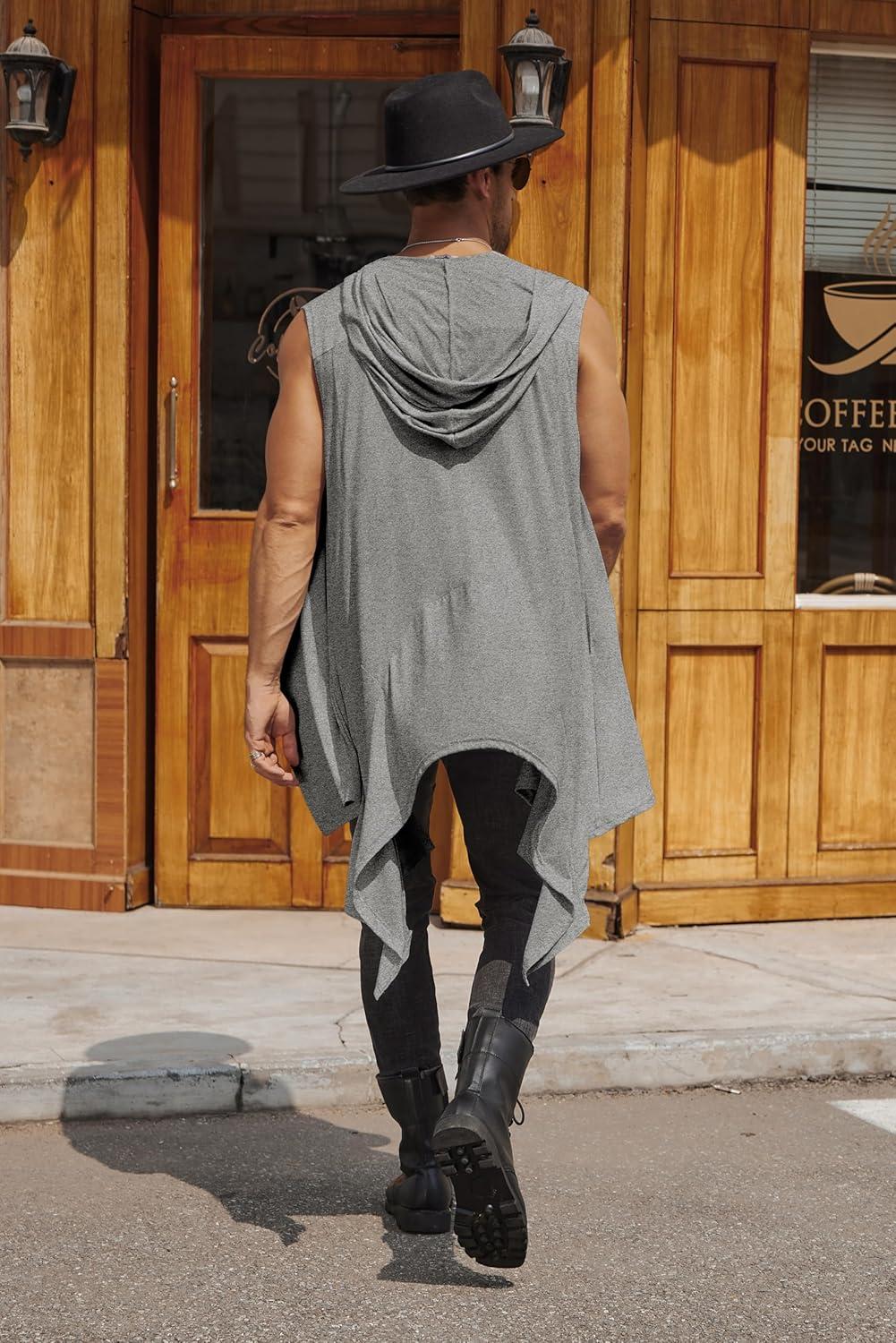 COOFANDY Men's Long Hooded Cardigan Sleeveless Ruffle Shawl Collar Lightweight Open Front Drape Kimono Vest(Middle Grey)