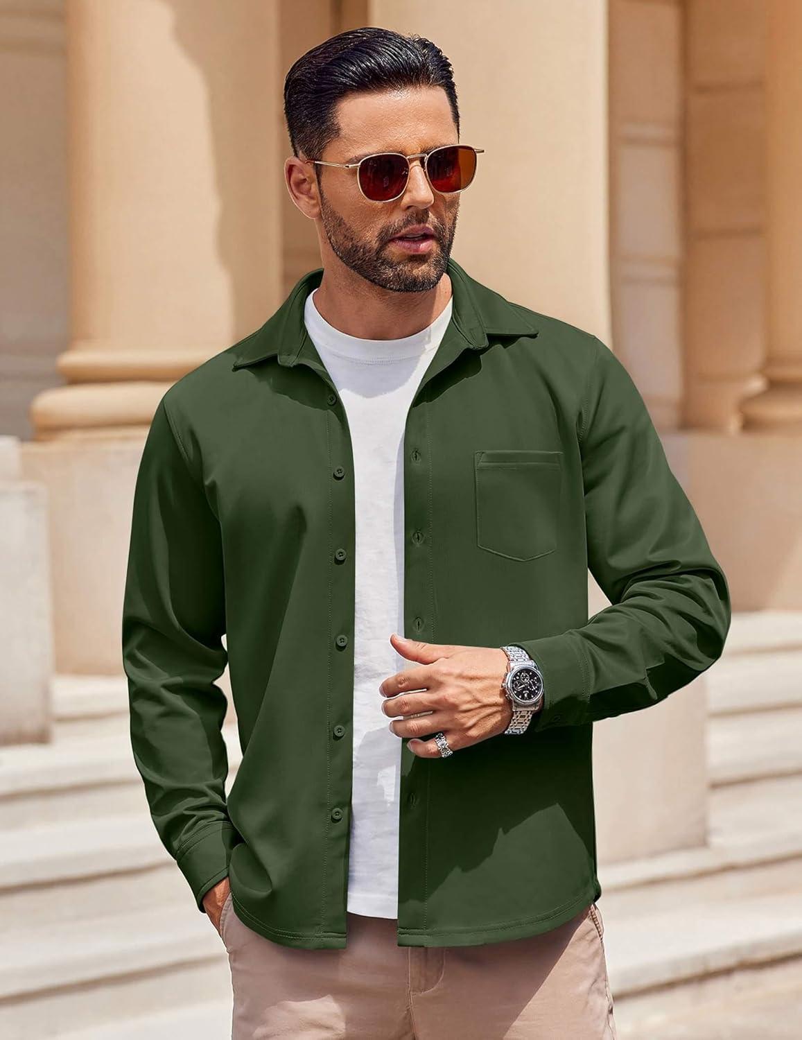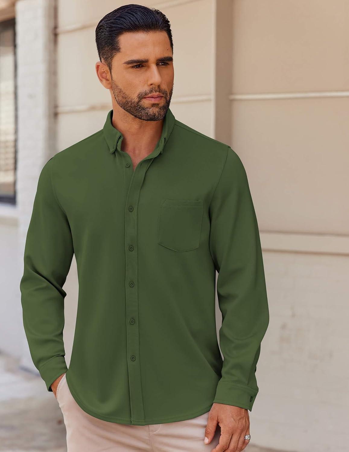 COOFANDY Mens Long Sleeve Button Down Shirt Wrinkle Free Casual Shirt for Men Untucked Shirts with Pocket for Wedding(Army Green)