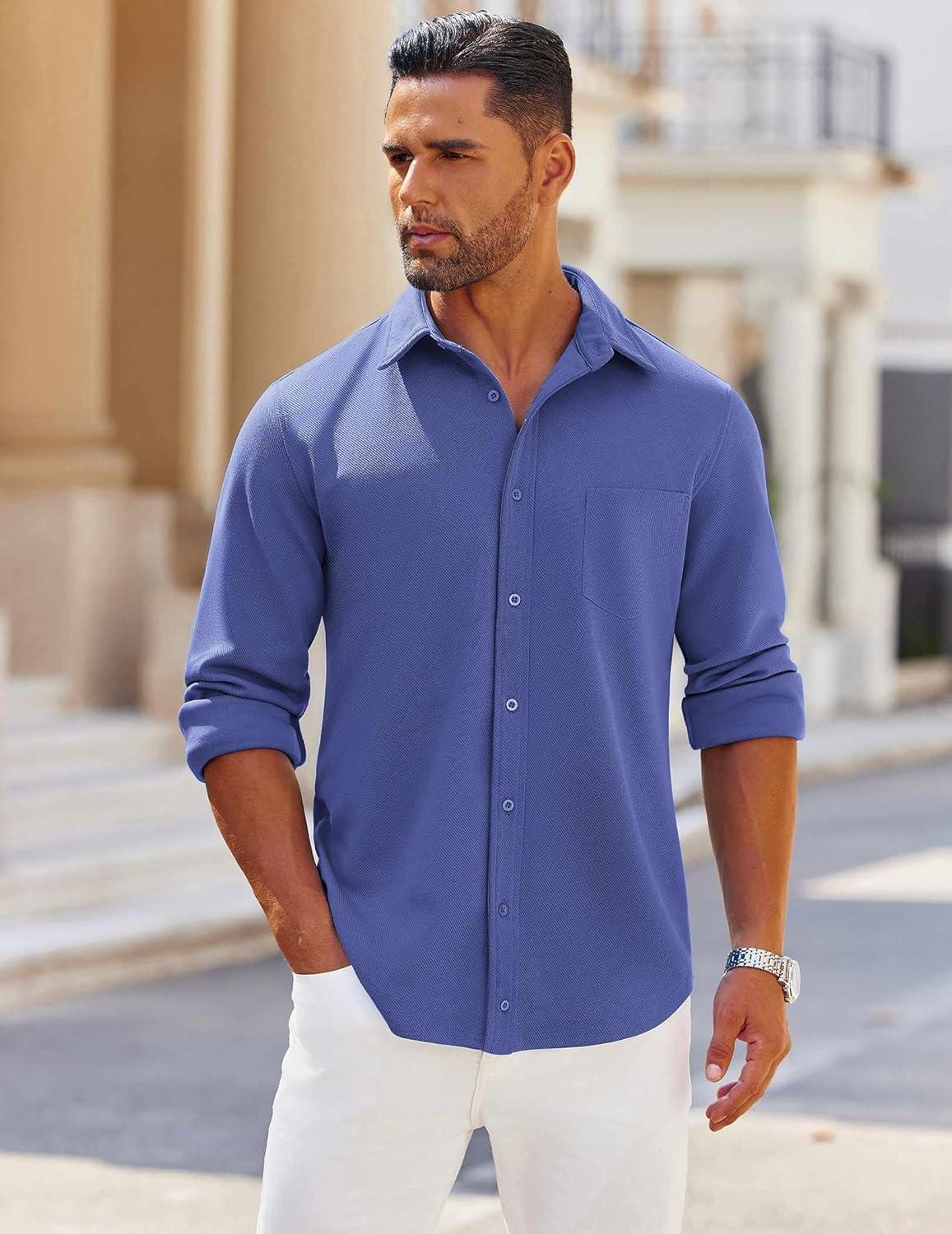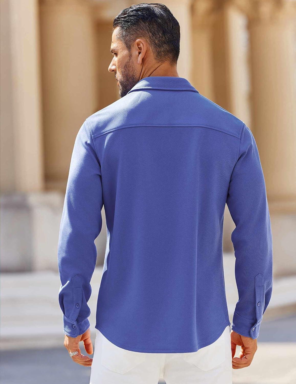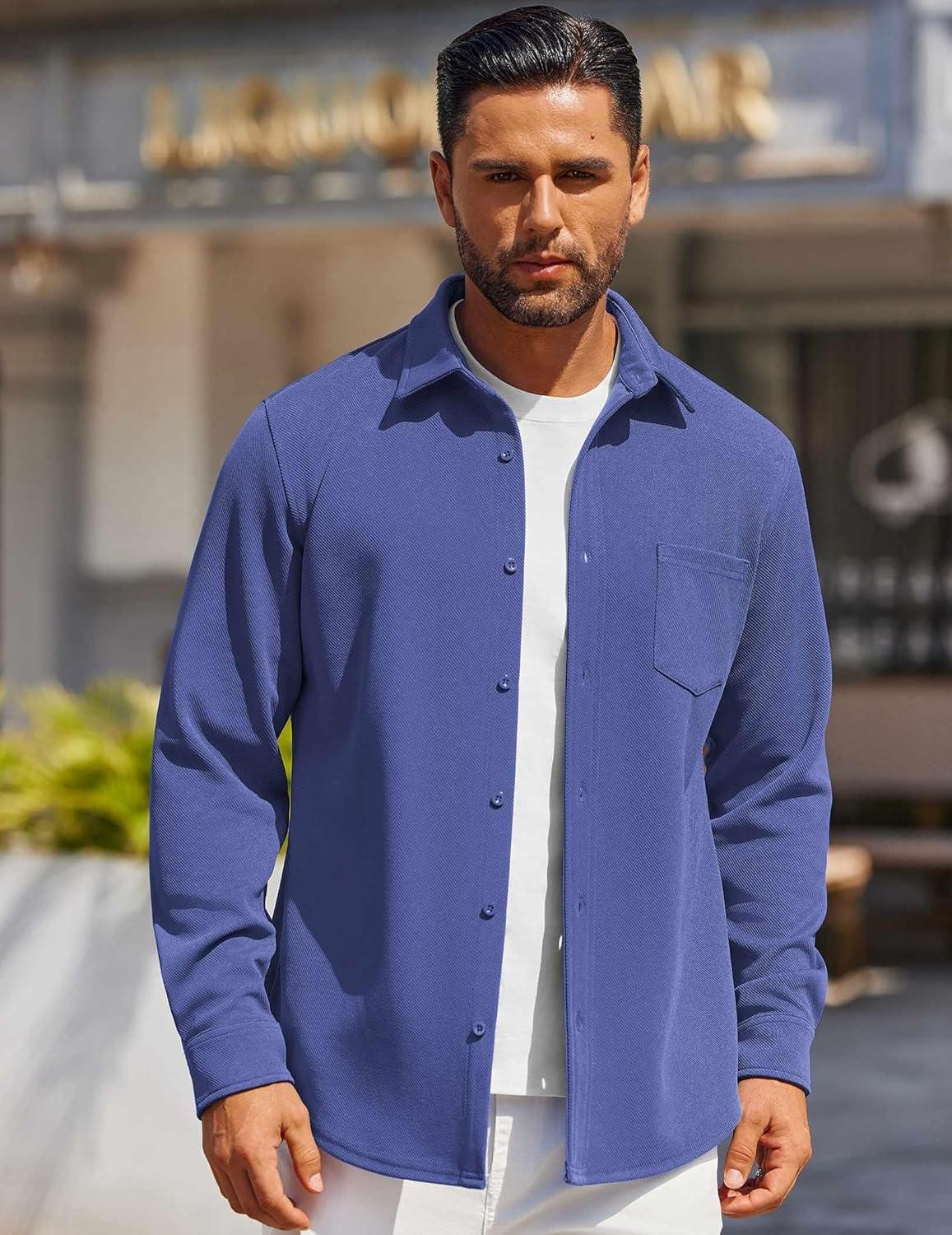 COOFANDY Mens Long Sleeve Button Down Shirts Wrinkle Free Shacket Jacket Stretch Casual Overshirt(Blue)