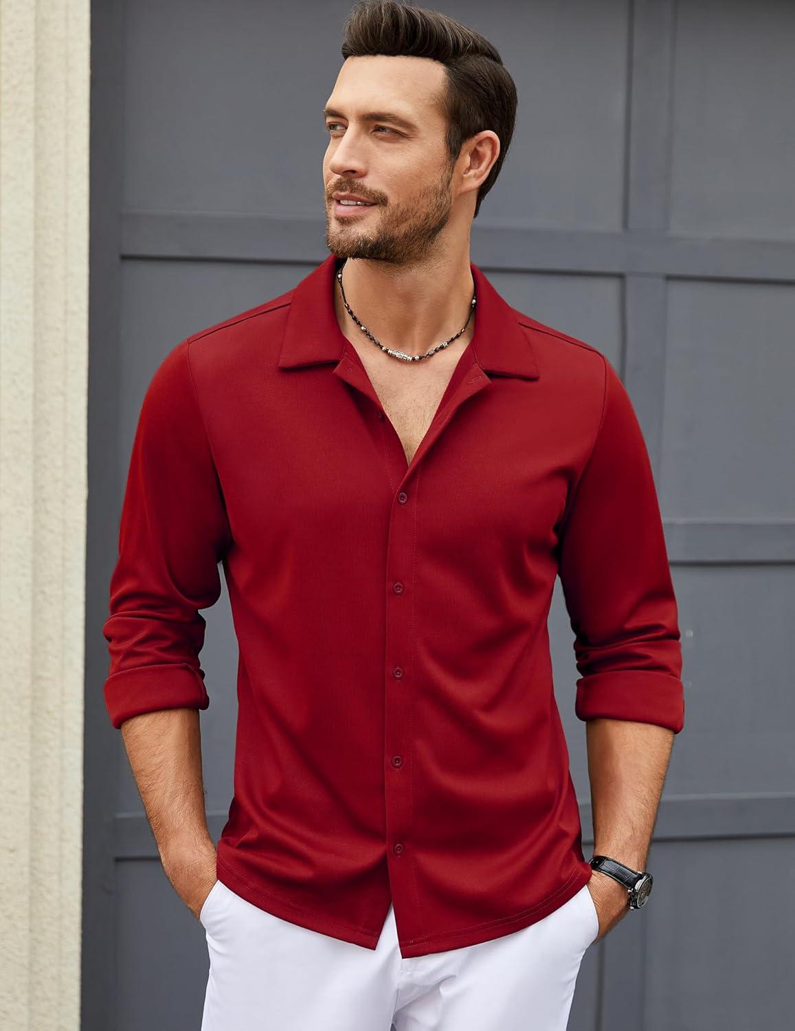 COOFANDY Men's Long Sleeve Button Down Wrinkle Free Shirt Casual Untucked Stretch Dress Shirts(Red Dahlia)