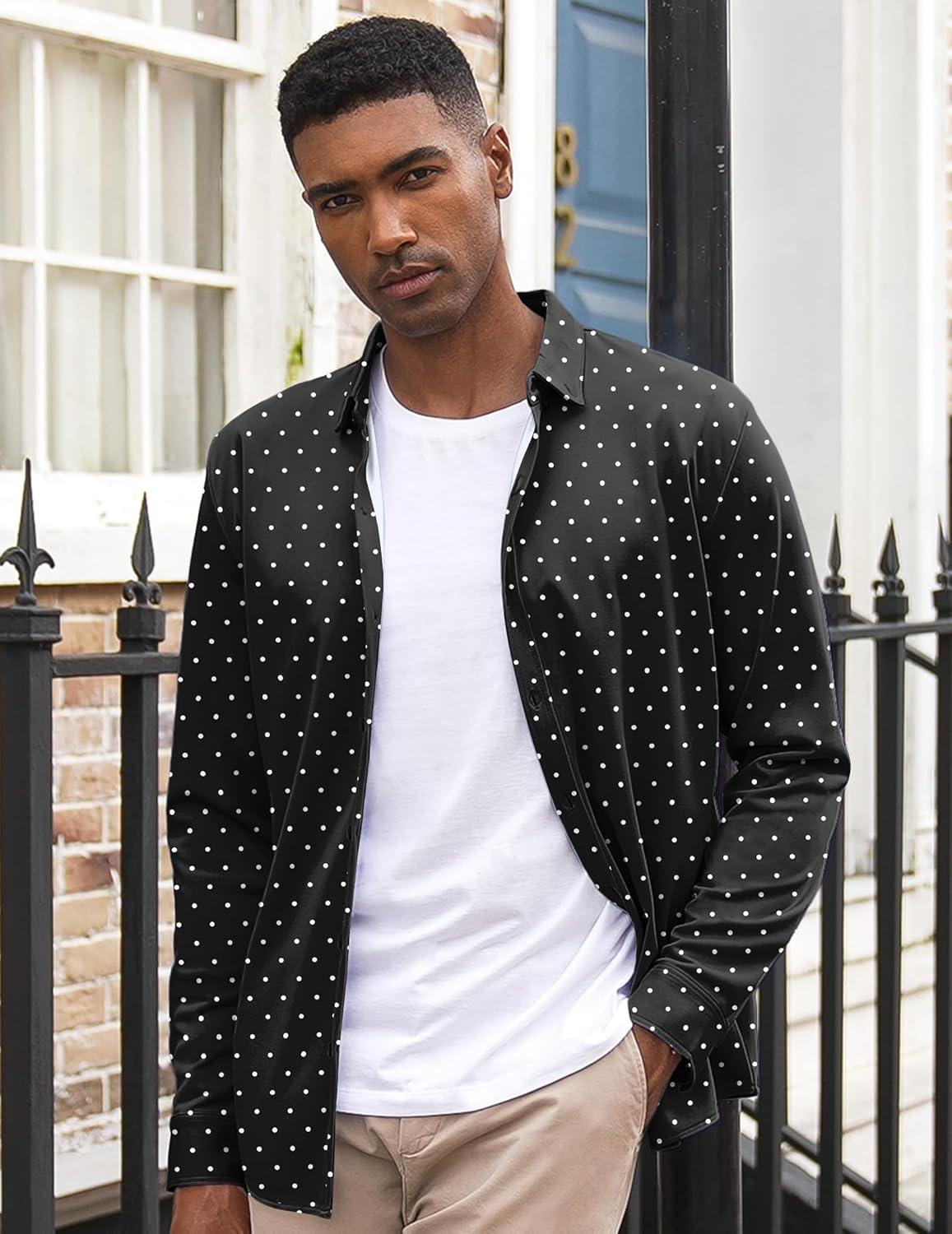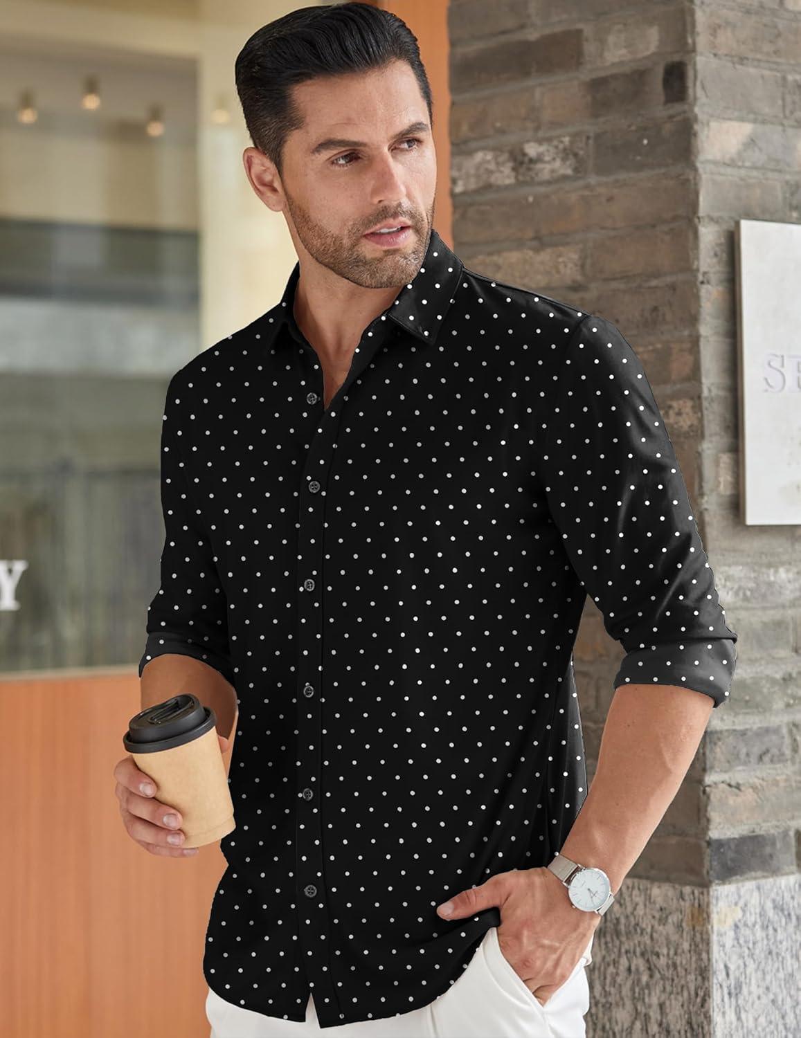 COOFANDY Men’s Long Sleeve Dress Shirt Casual Button Down Shirts Wrinkle Free Untucked Shirt(White Dots Black)