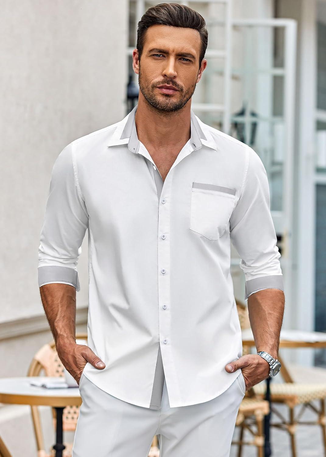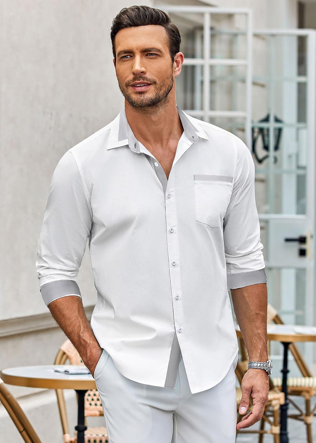COOFANDY Men's Long Sleeve Dress Shirt Plaid Collar Casual Button Down Shirts(White/Grey)