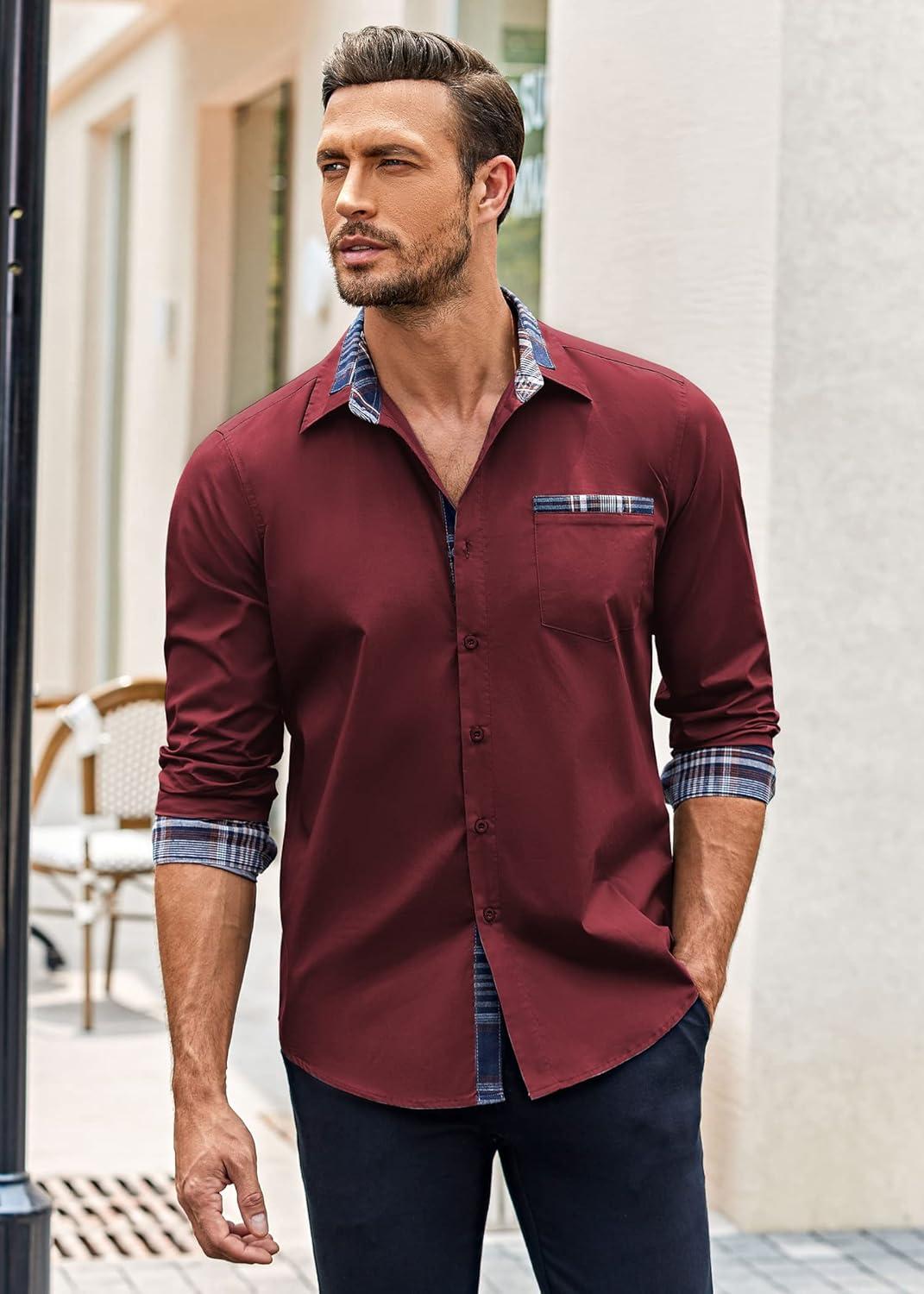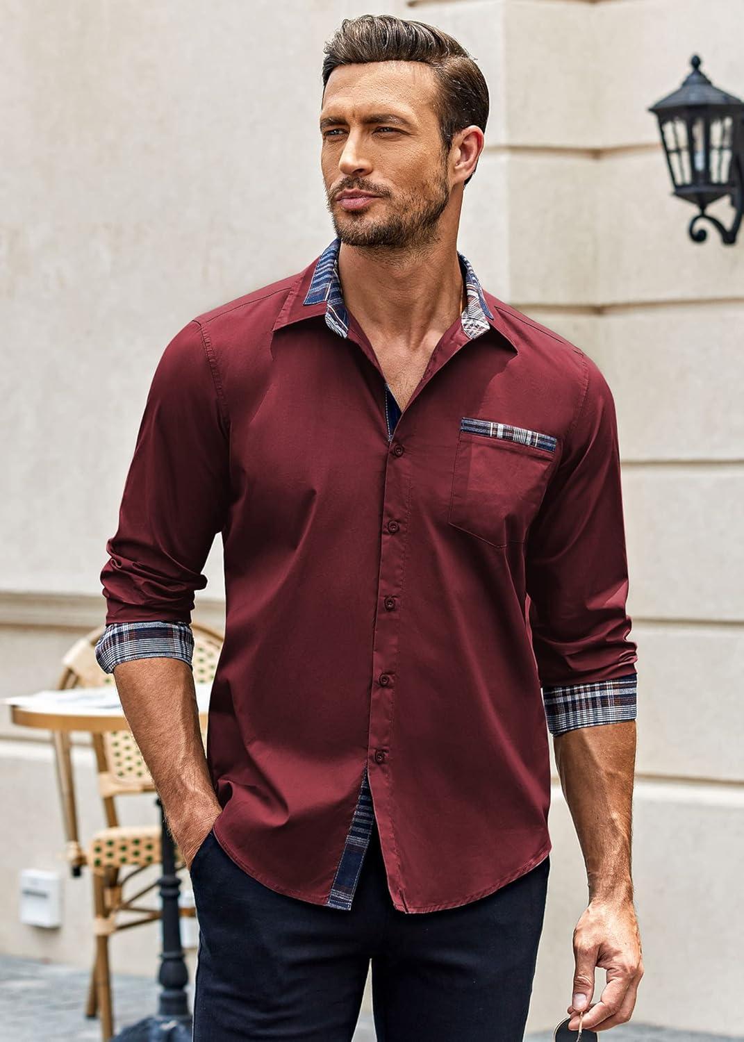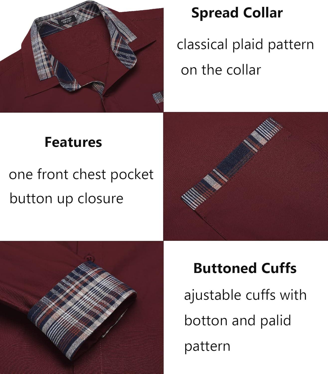 COOFANDY Men's Long Sleeve Dress Shirt Plaid Collar Casual Button Down Shirts(Wine Red)