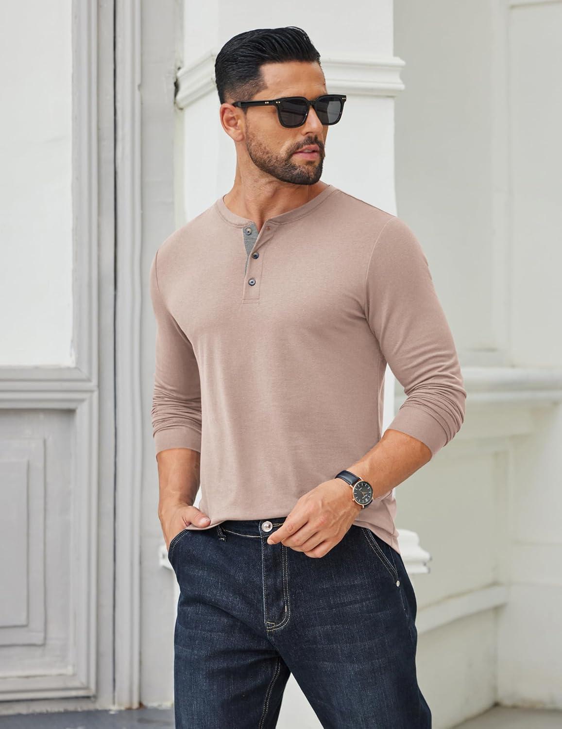COOFANDY Men’s Long Sleeve Henley Shirts Cotton T-Shirts Casual Pullover Shirt Soft Stretch Basic Tees Fall Tops(Beige)