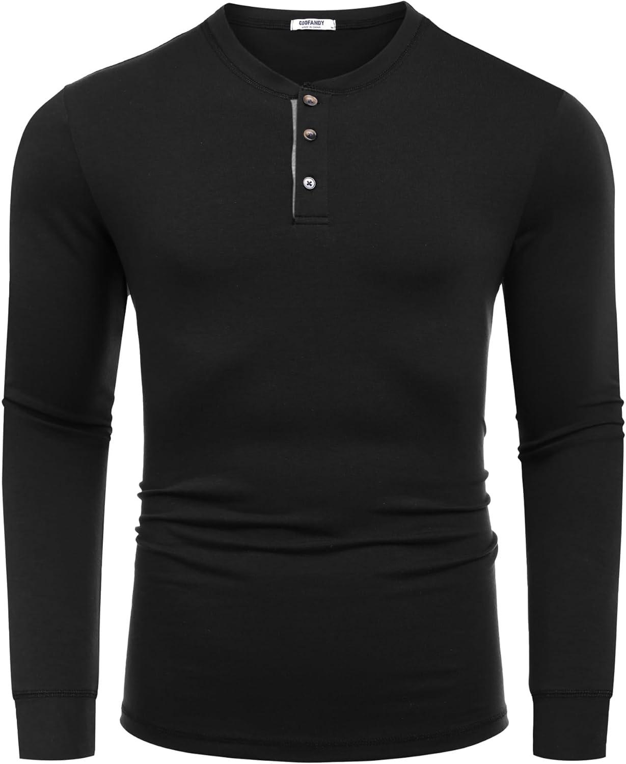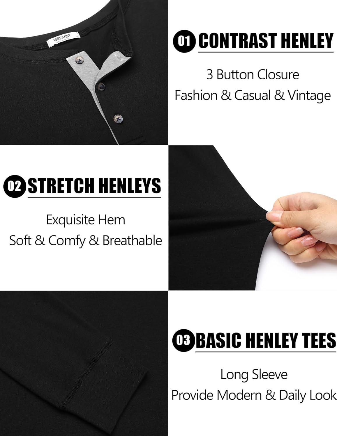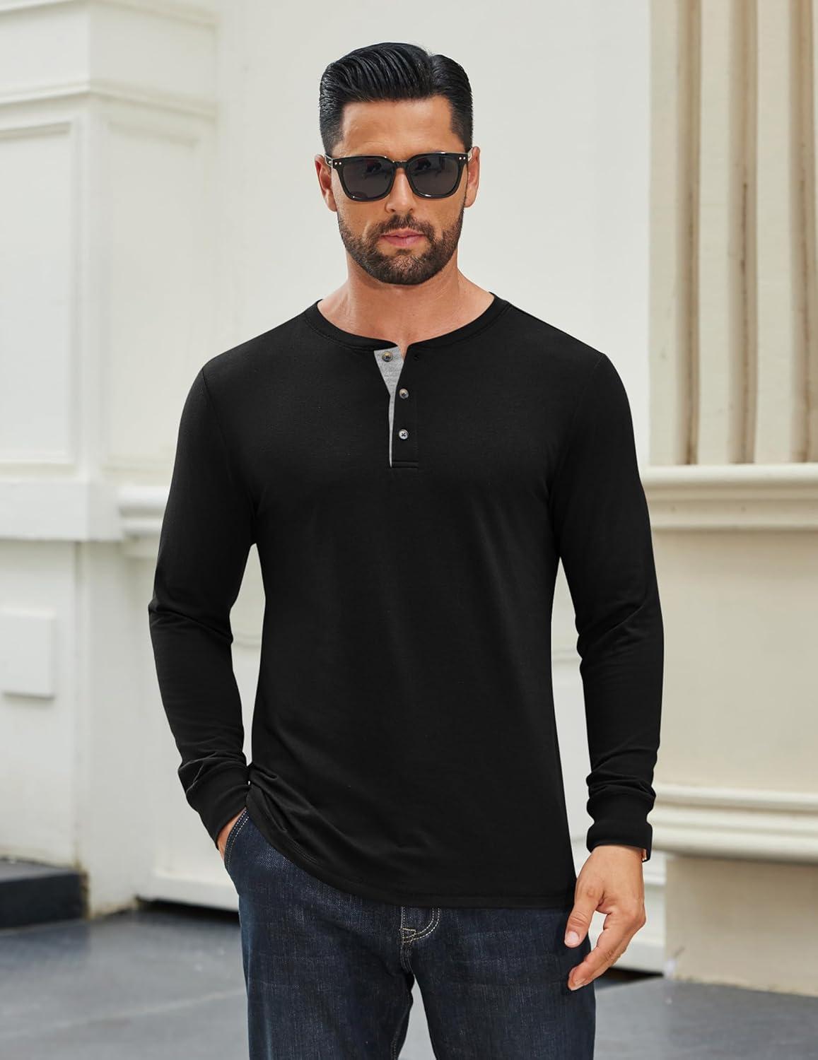 COOFANDY Men's Long Sleeve Henley Shirts Cotton T-Shirts Casual Pullover Shirt Soft Stretch Basic Tees Fall Tops(Black 01 - Grey Collar)