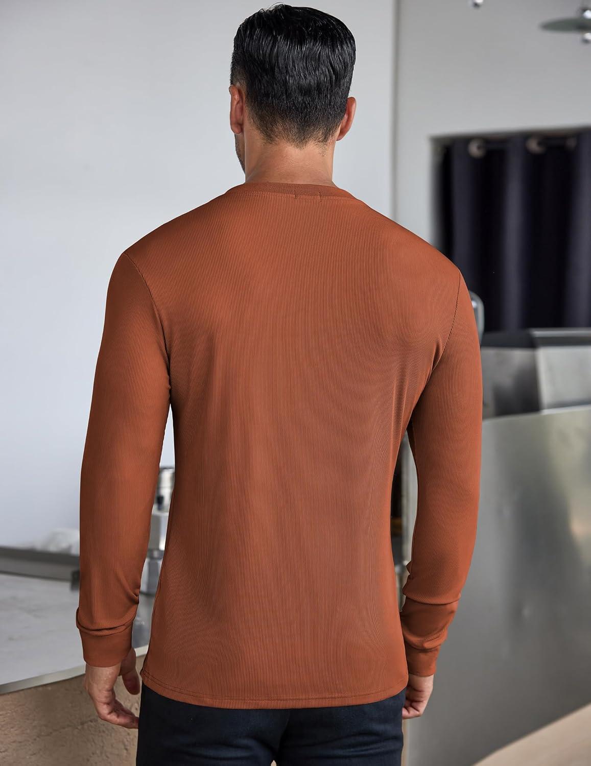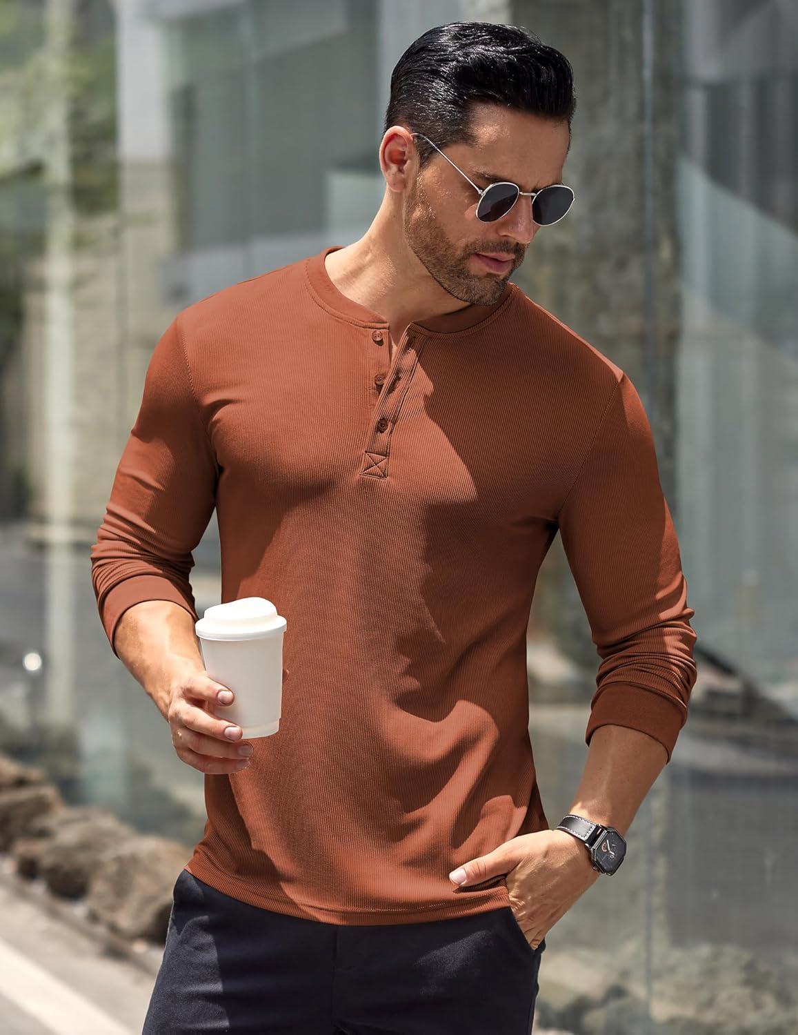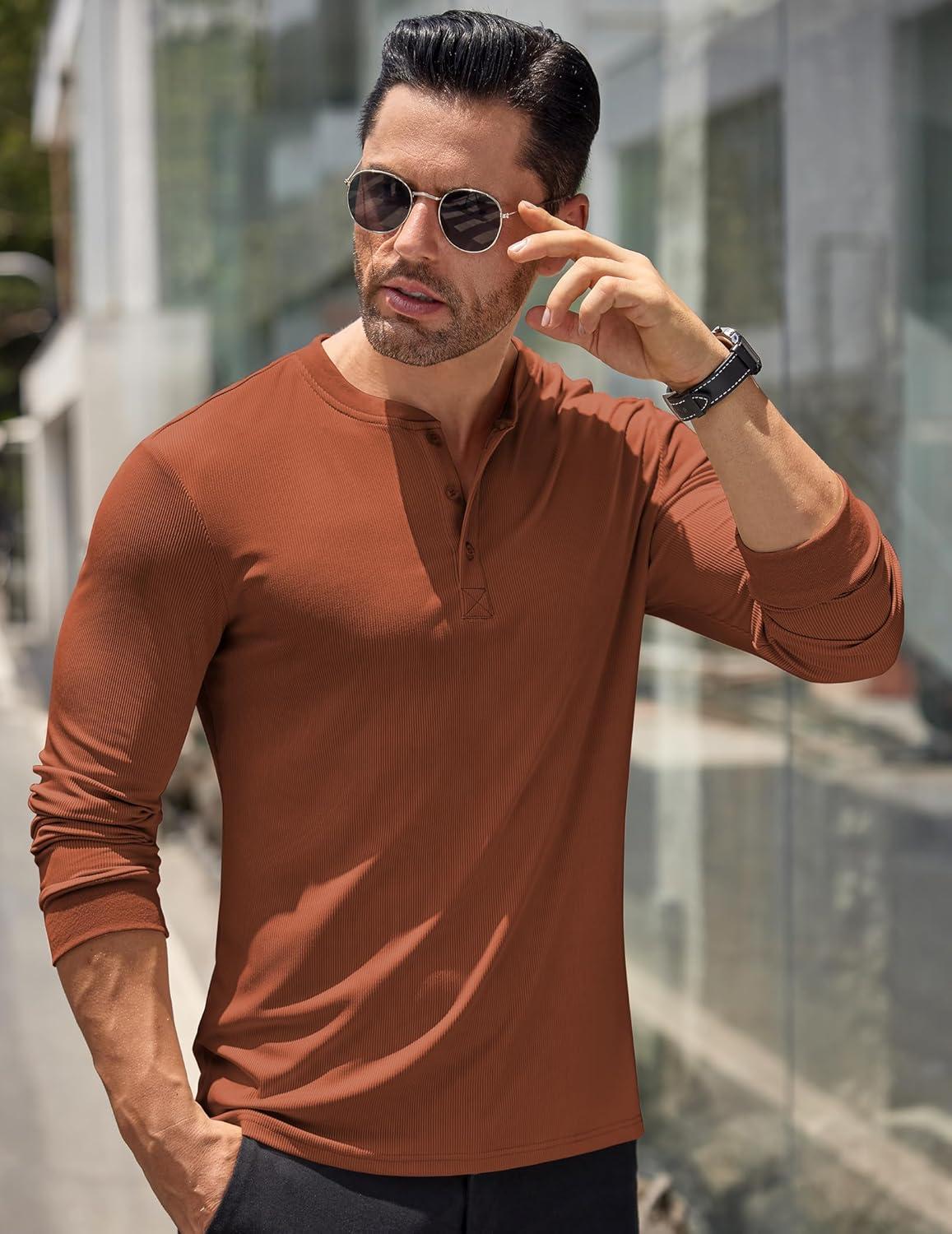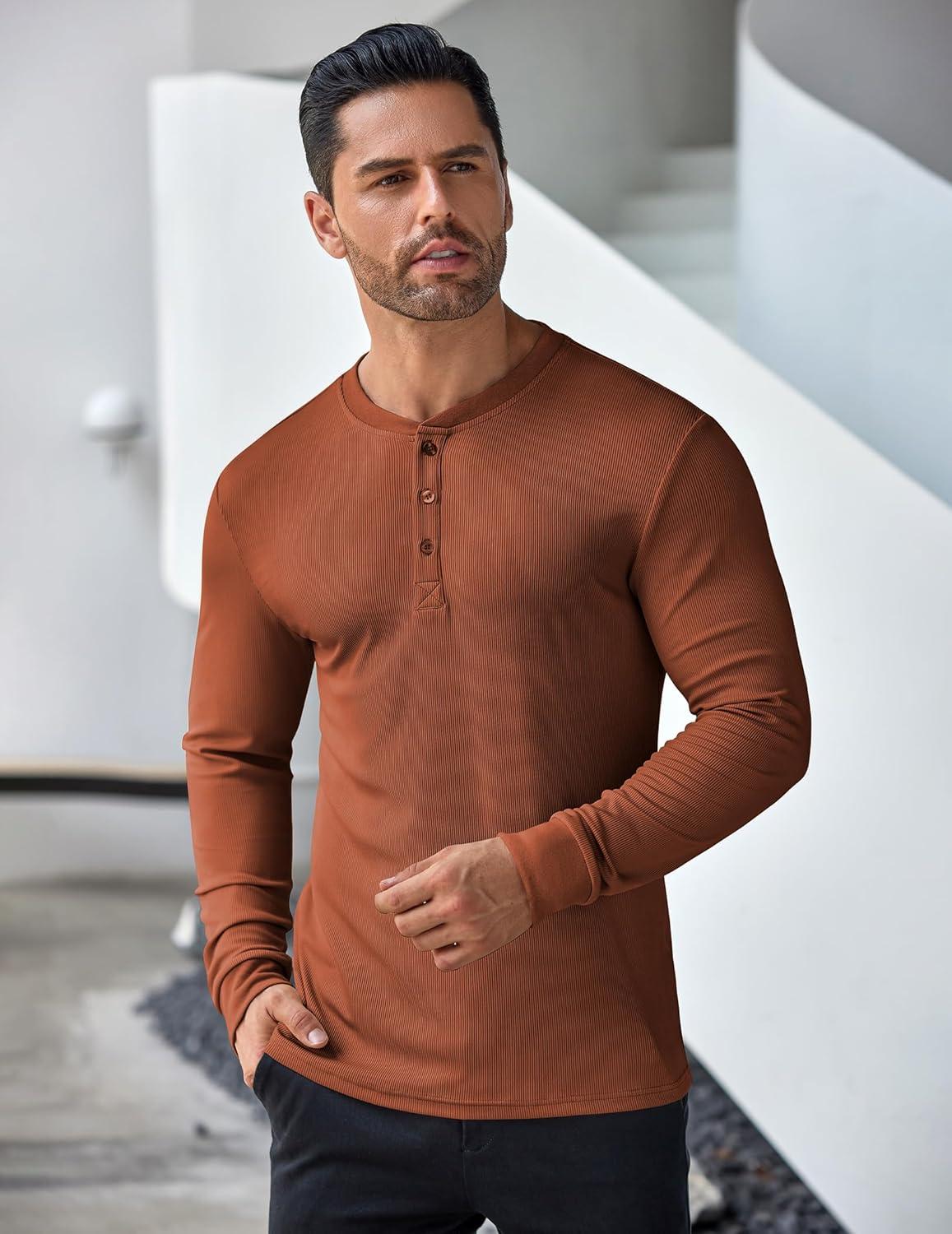 COOFANDY Men's Long Sleeve Henley Shirts Stretch Ribbed T-Shirts Fashion Casual Basic Tops(Caramel)