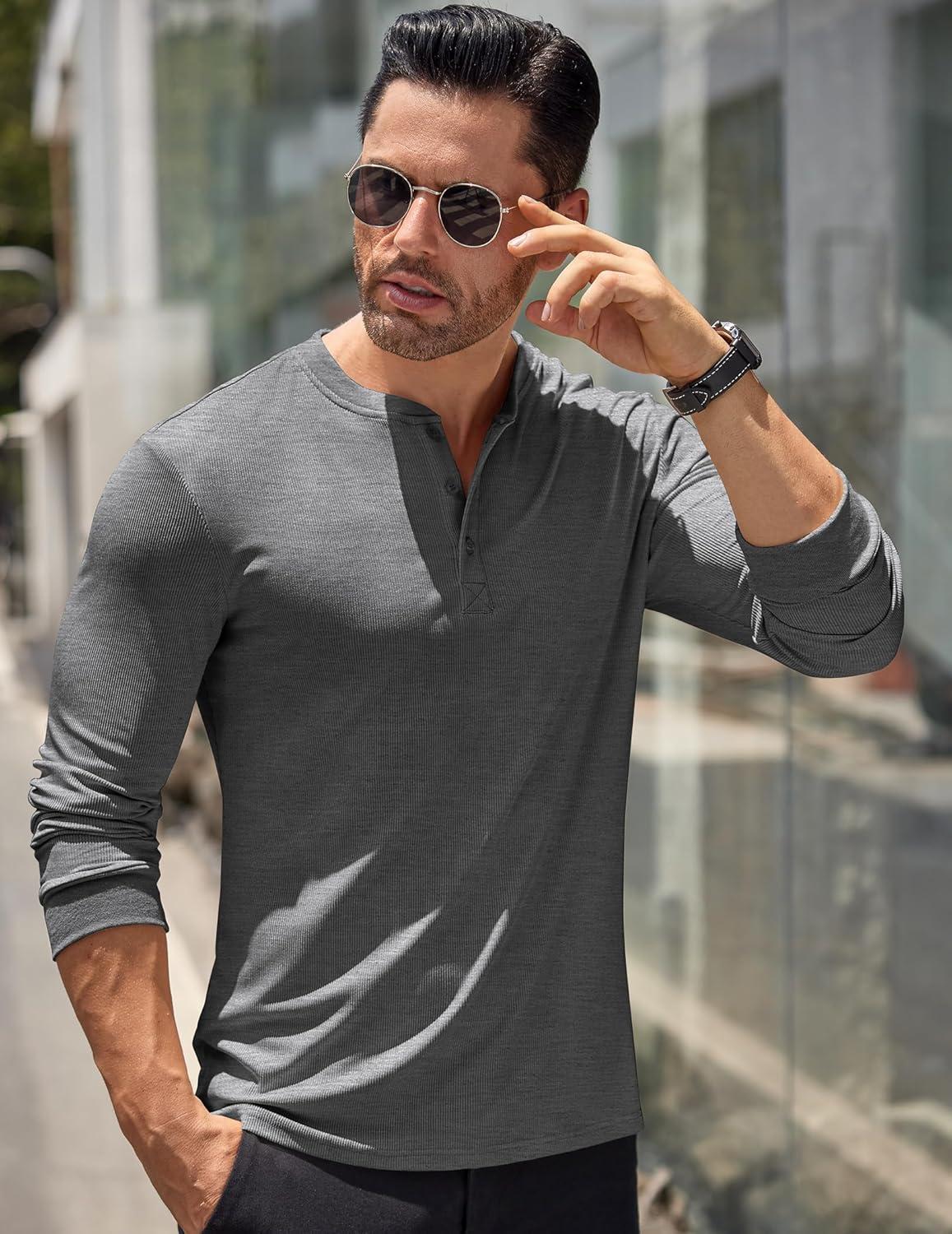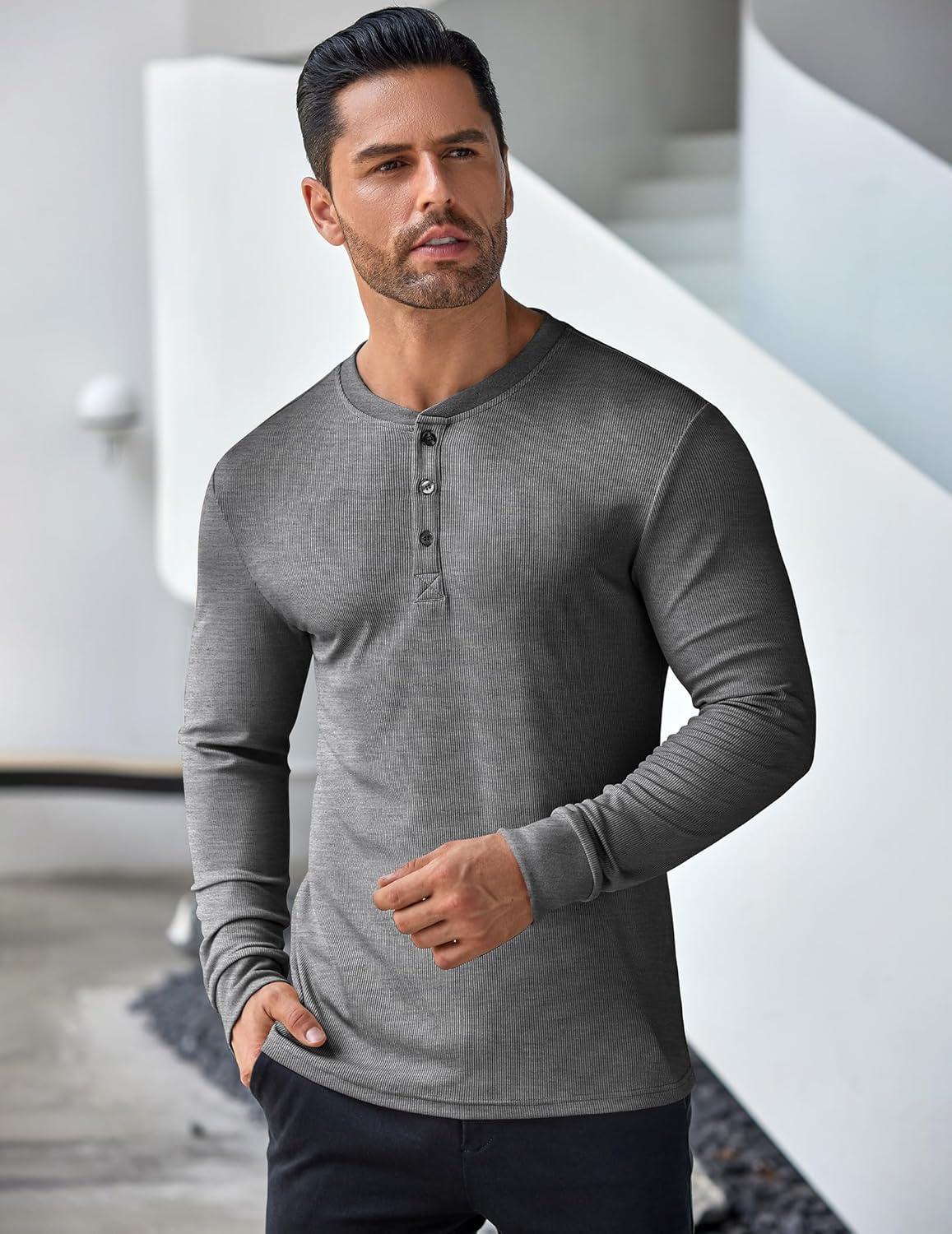 COOFANDY Men's Long Sleeve Henley Shirts Stretch Ribbed T-Shirts Fashion Casual Basic Tops(Heather Grey)