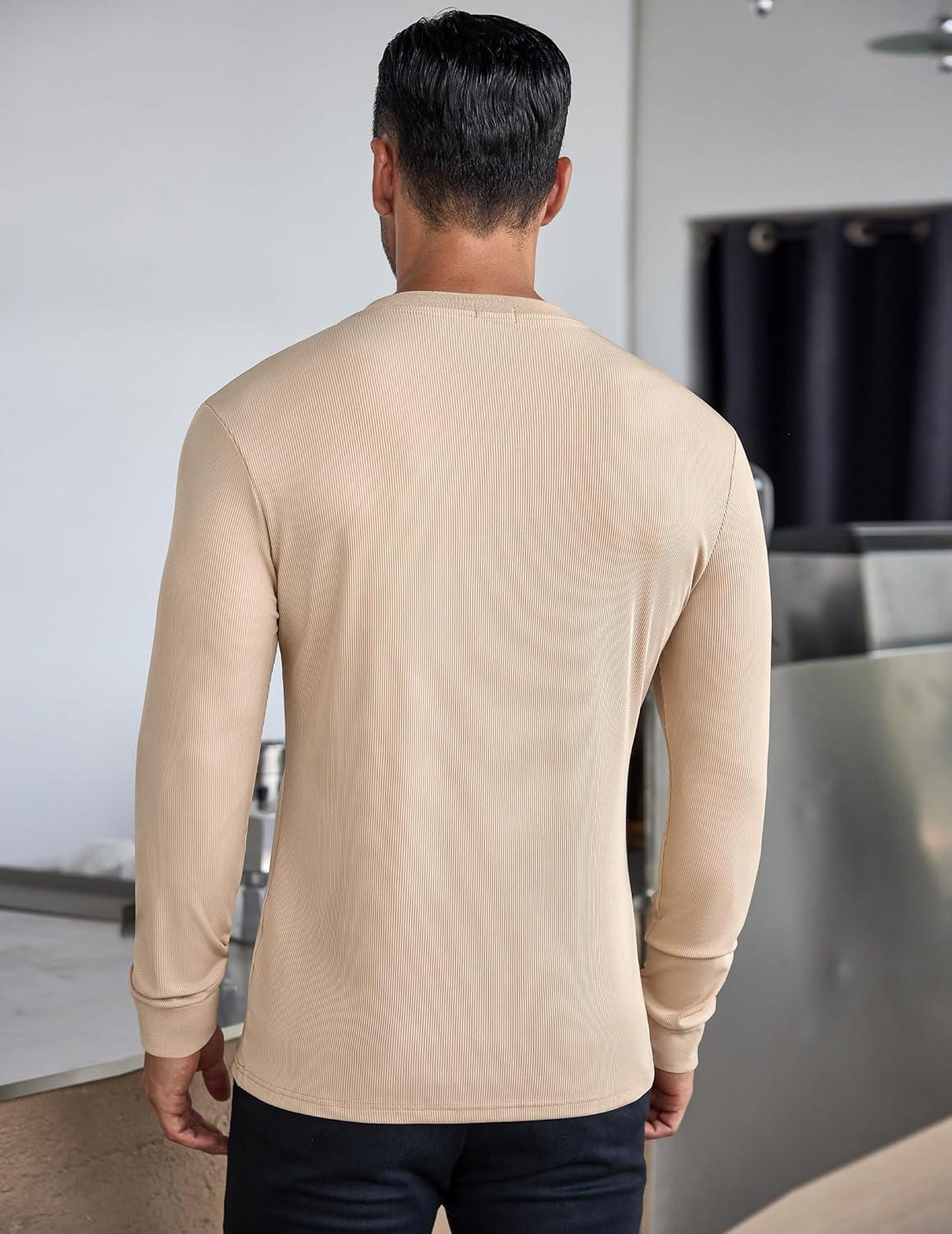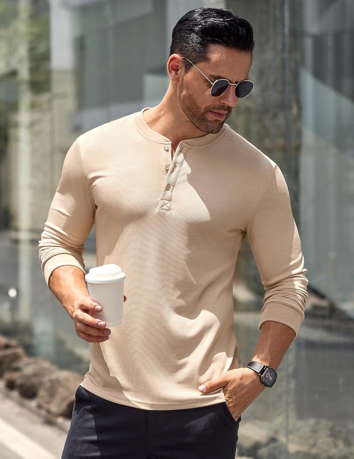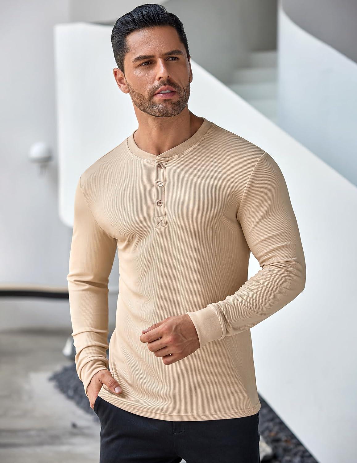 COOFANDY Men's Long Sleeve Henley Shirts Stretch Ribbed T-Shirts Fashion Casual Basic Tops(Khaki)