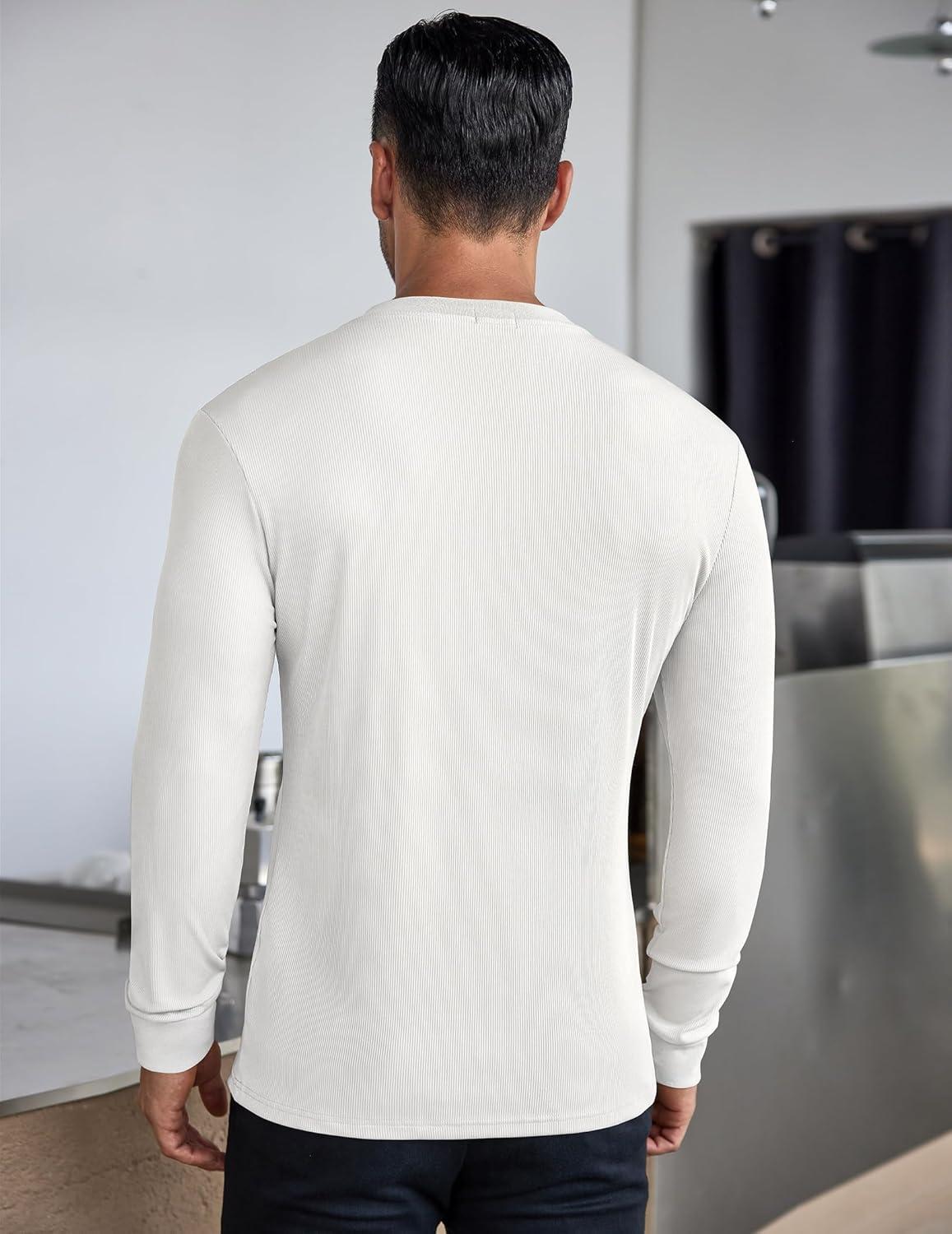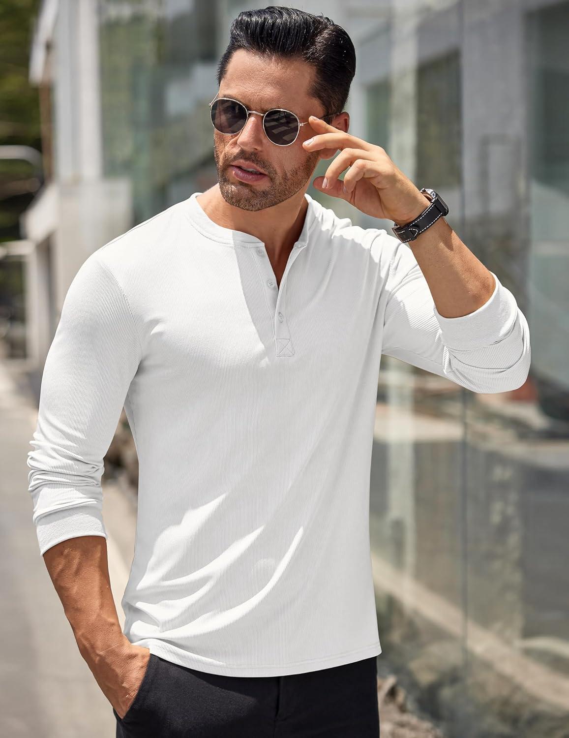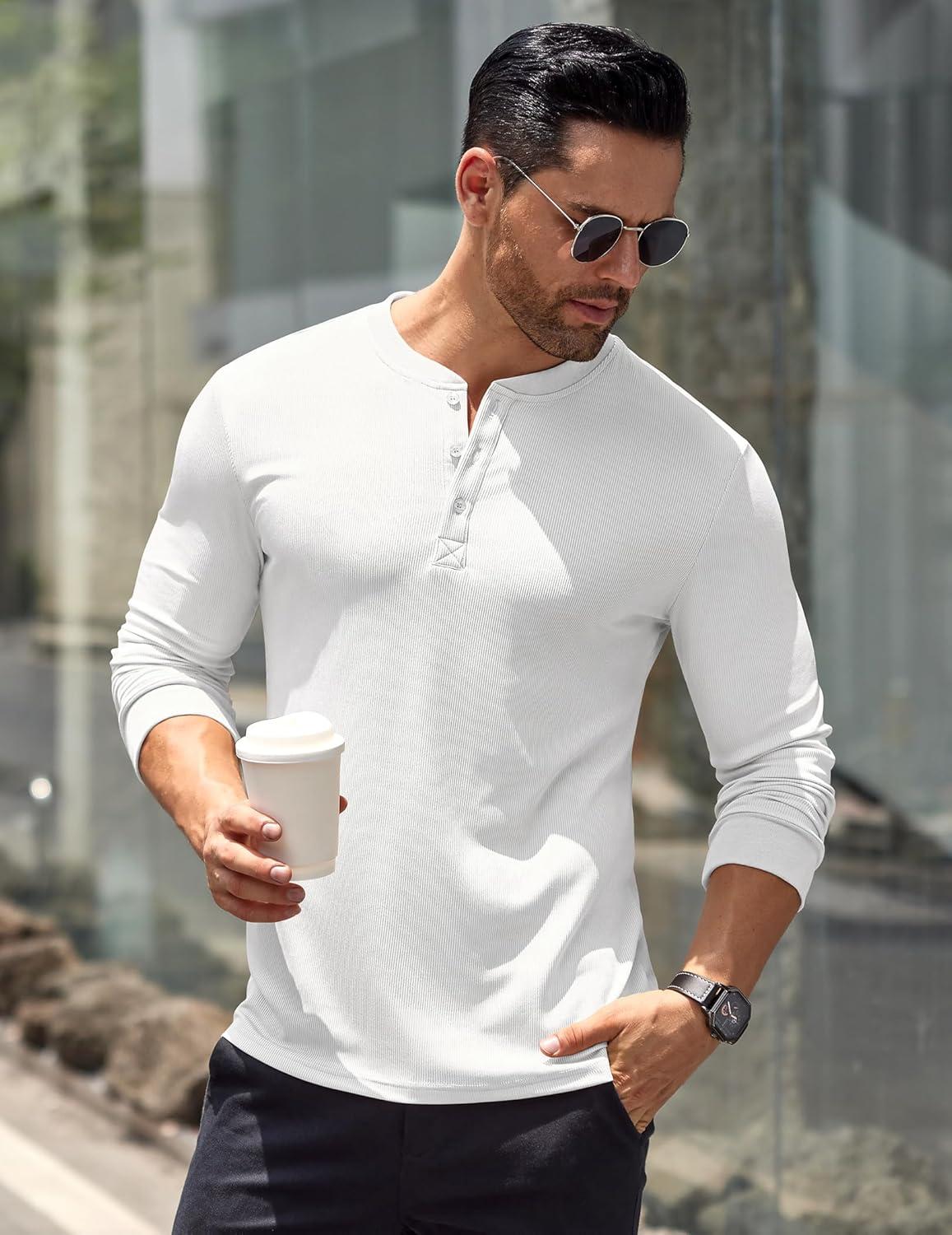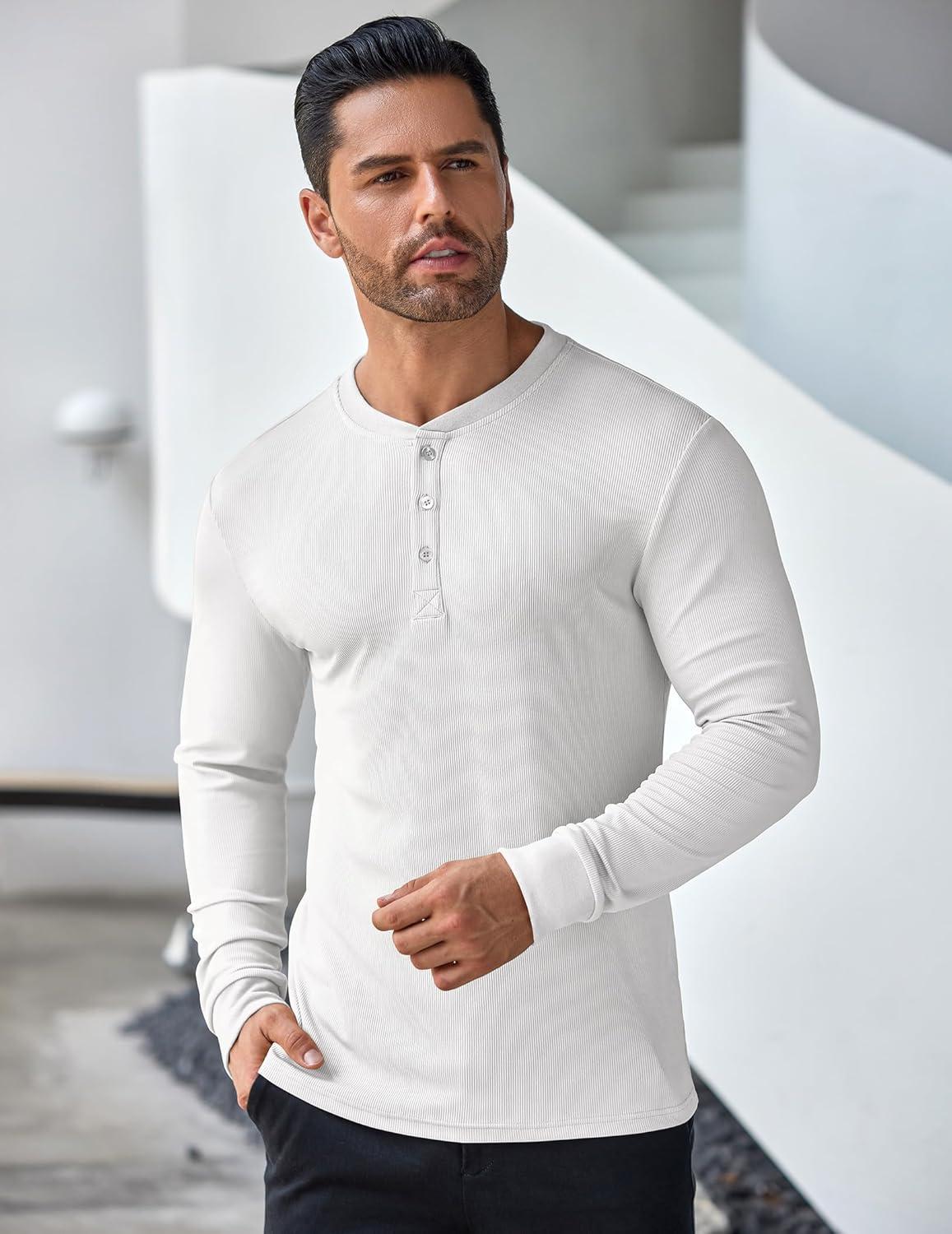COOFANDY Men's Long Sleeve Henley Shirts Stretch Ribbed T-Shirts Fashion Casual Basic Tops(White)
