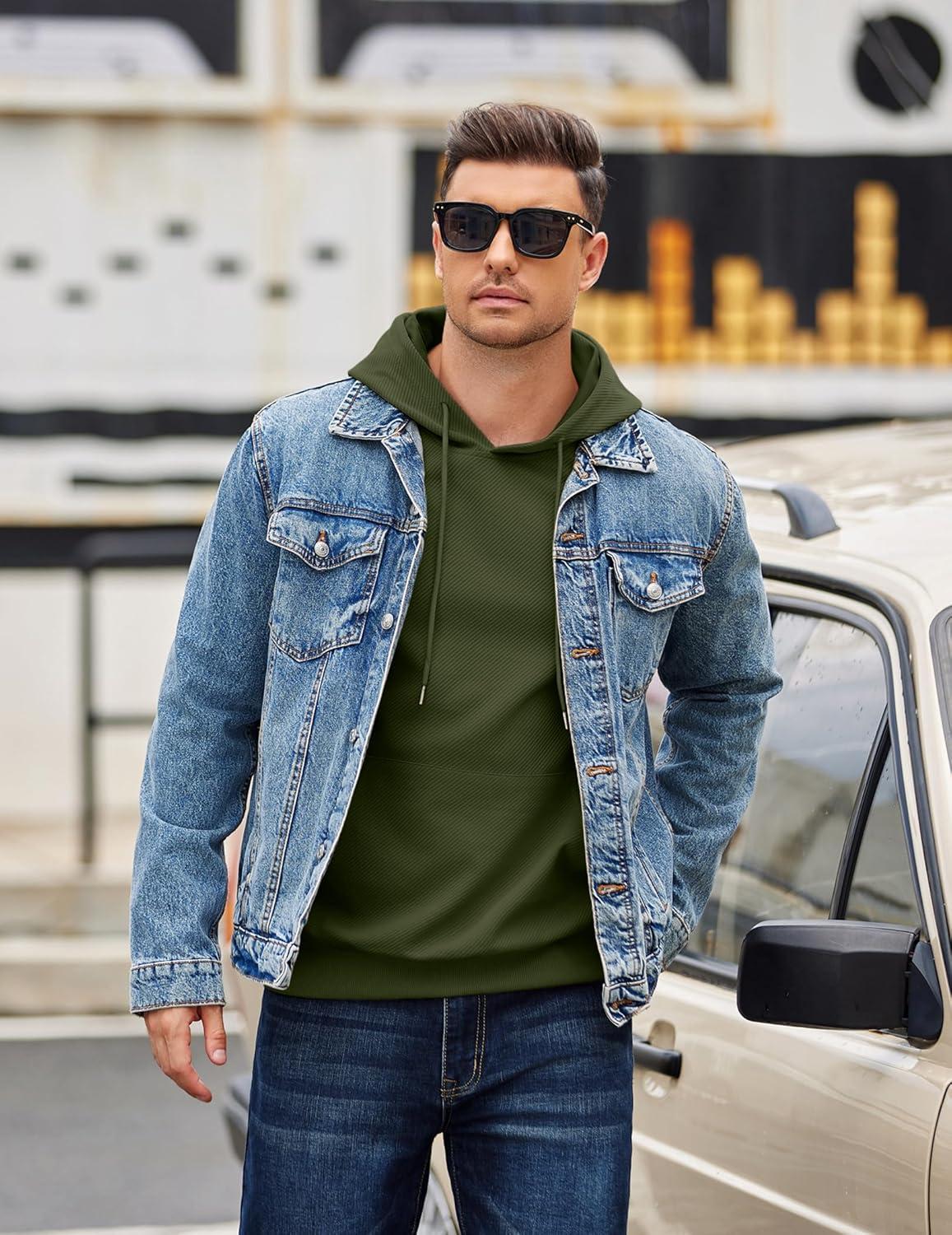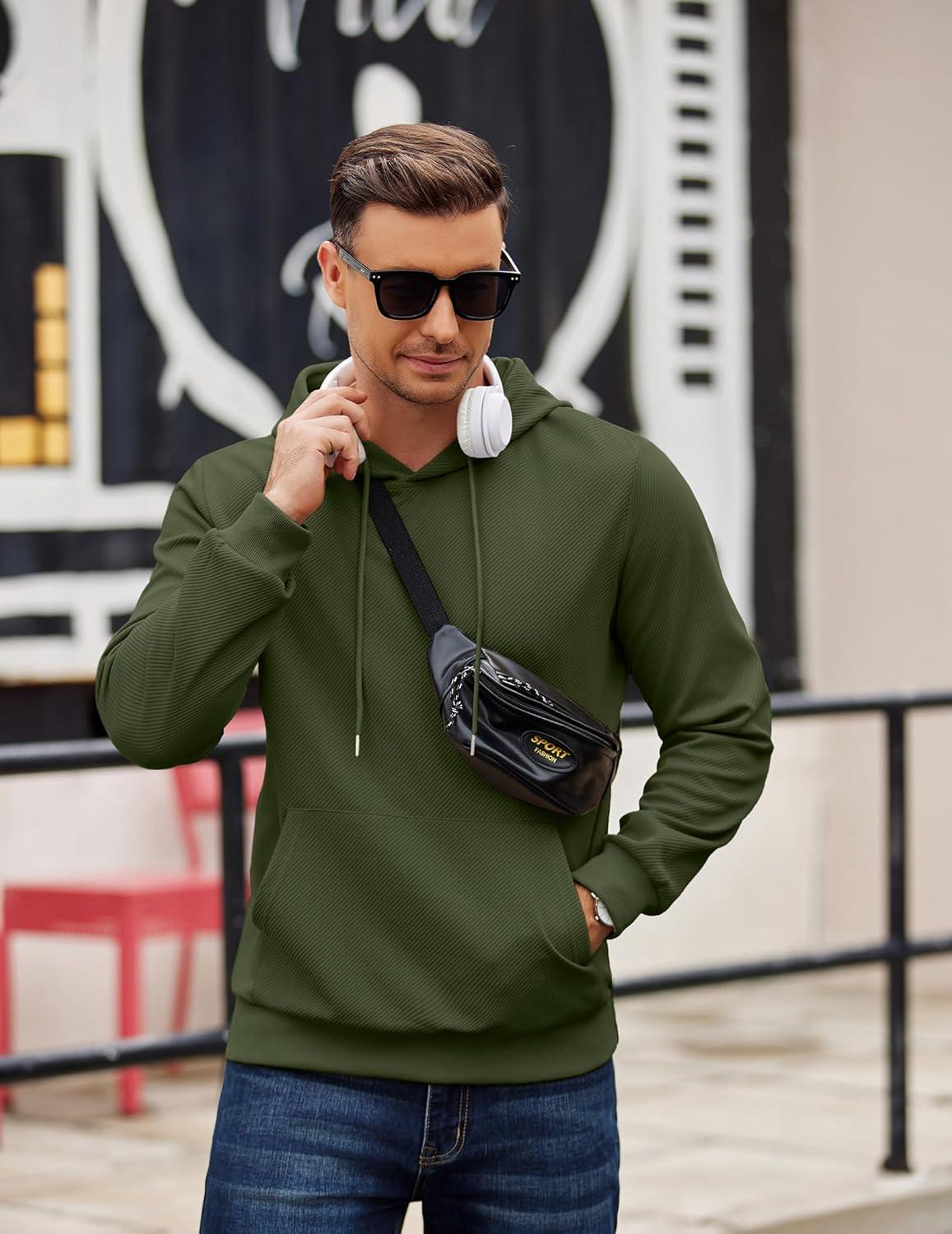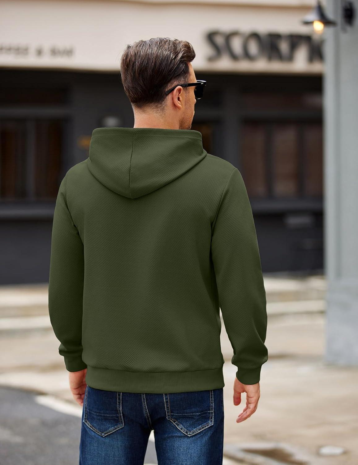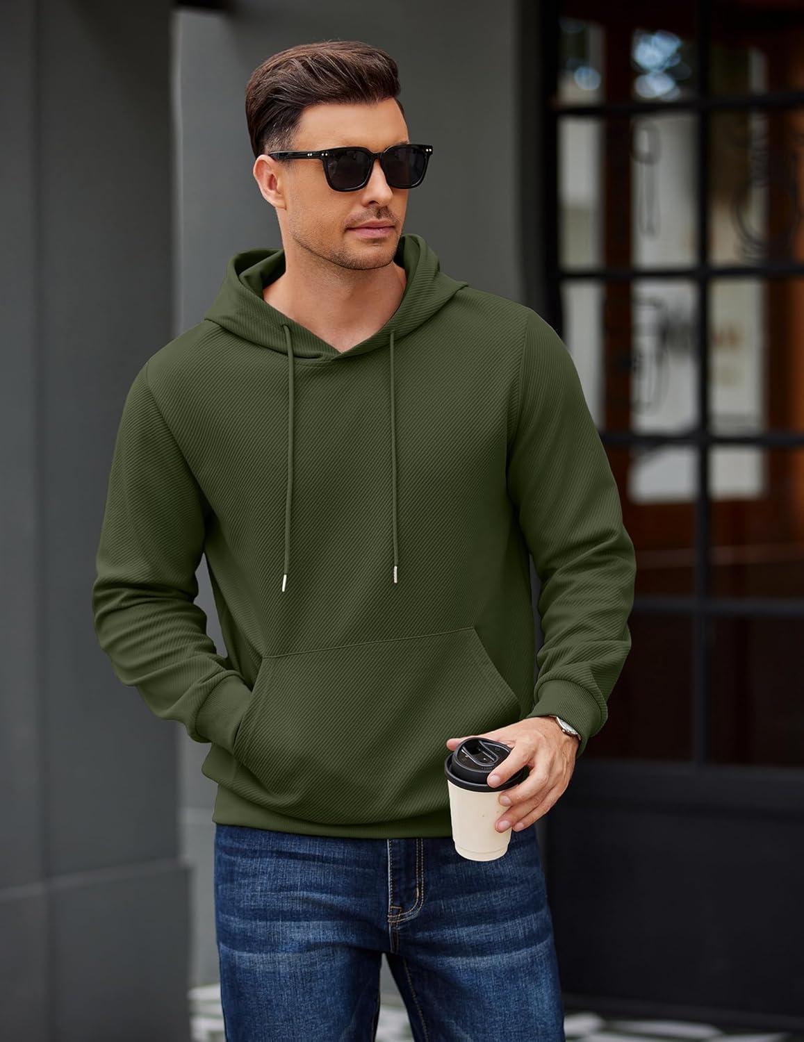 COOFANDY Men’s Long Sleeve Hooded Sweatshirt Casual Lightweight Hoodies Pullover Textured Drawstring Hoodie with Kanga Pocket(Army Green)