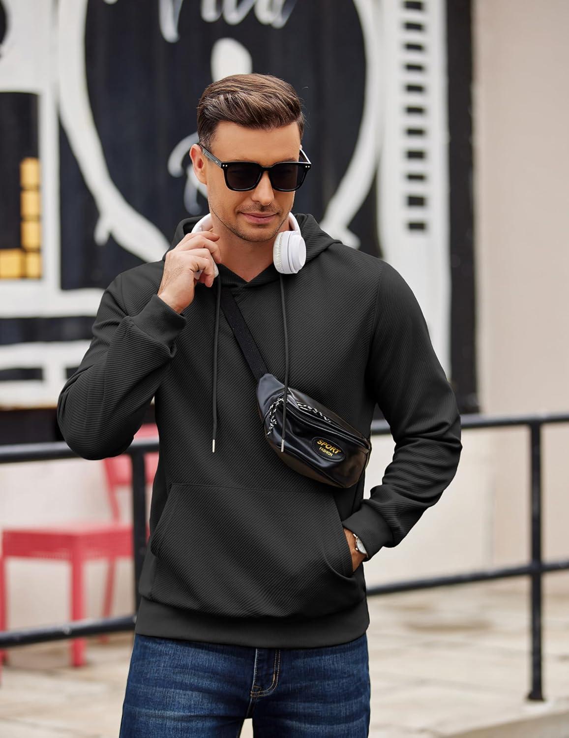 COOFANDY Men's Long Sleeve Hooded Sweatshirt Casual Lightweight Hoodies Pullover Textured Drawstring Hoodie with Kanga Pocket(Black)