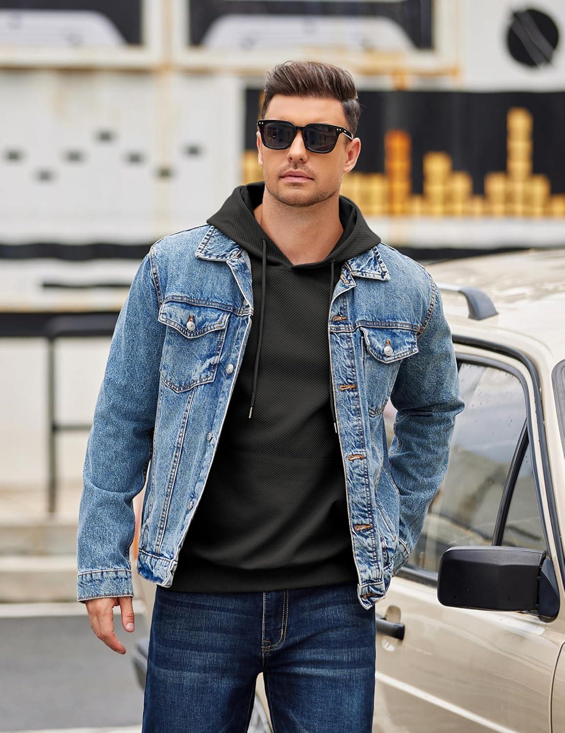 COOFANDY Men’s Long Sleeve Hooded Sweatshirt Casual Lightweight Hoodies Pullover Textured Drawstring Hoodie with Kanga Pocket(Black)