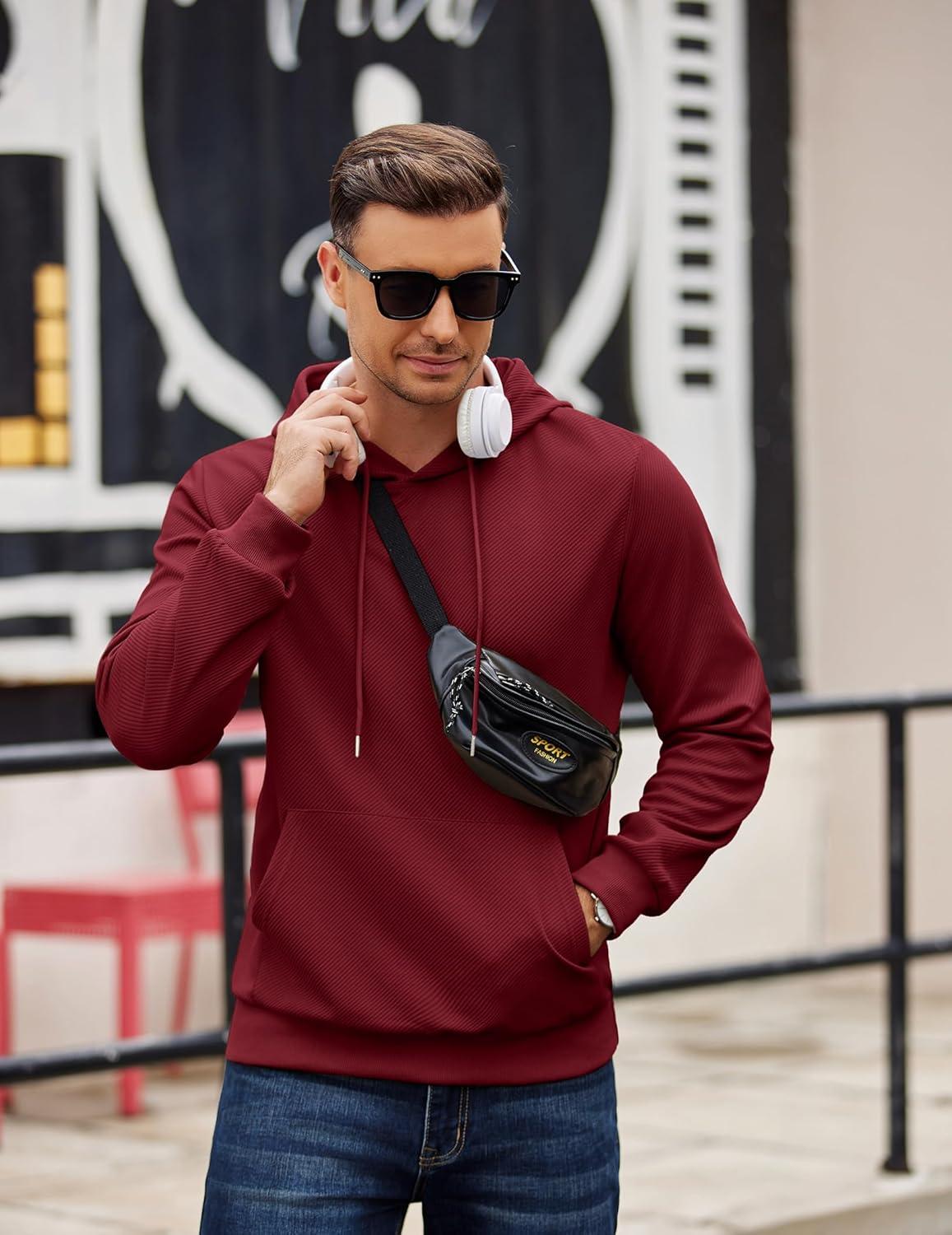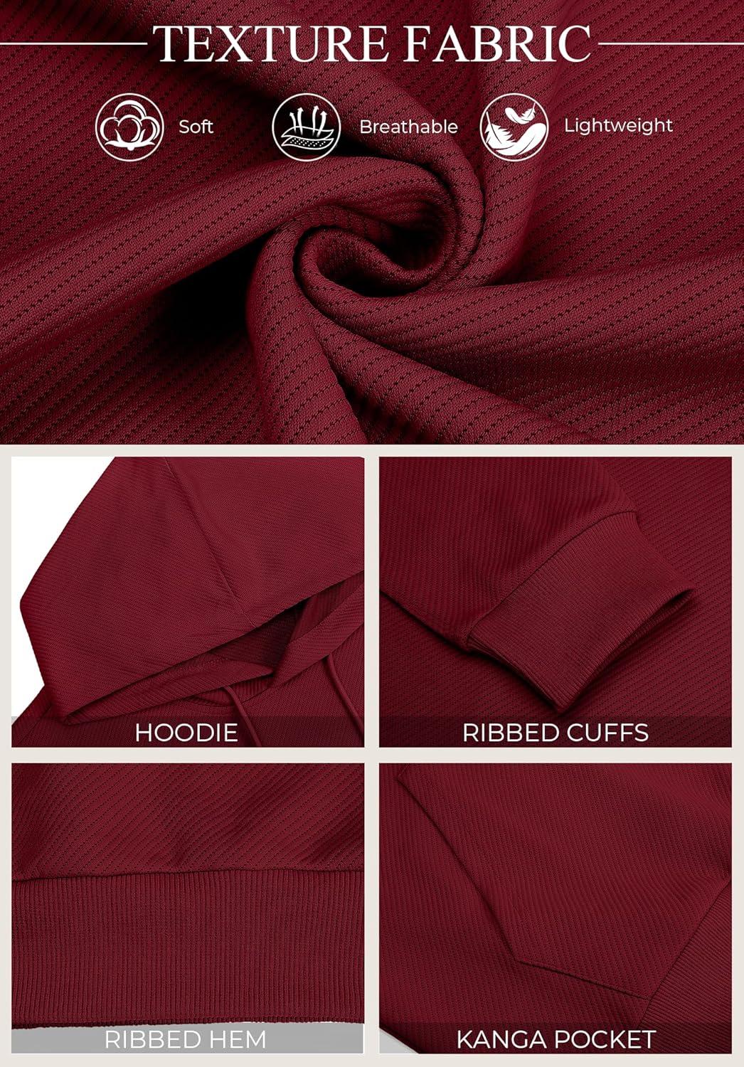 COOFANDY Men's Long Sleeve Hooded Sweatshirt Casual Lightweight Hoodies Pullover Textured Drawstring Hoodie with Kanga Pocket(Wine Red)