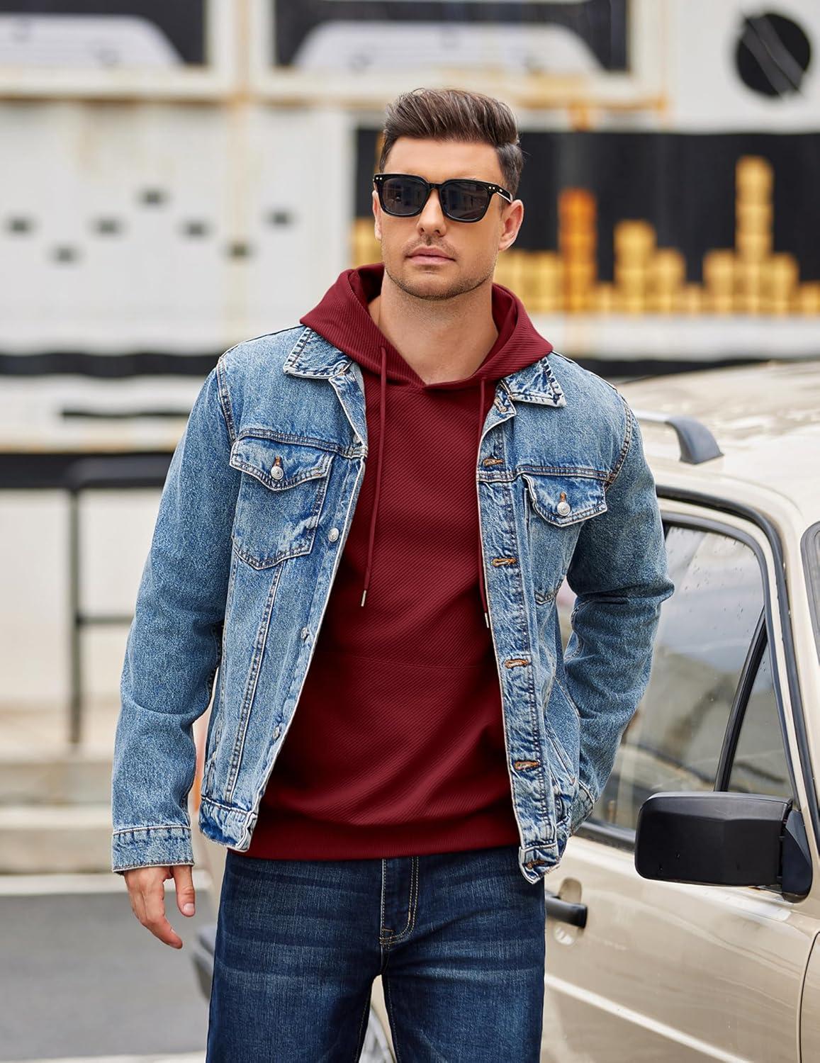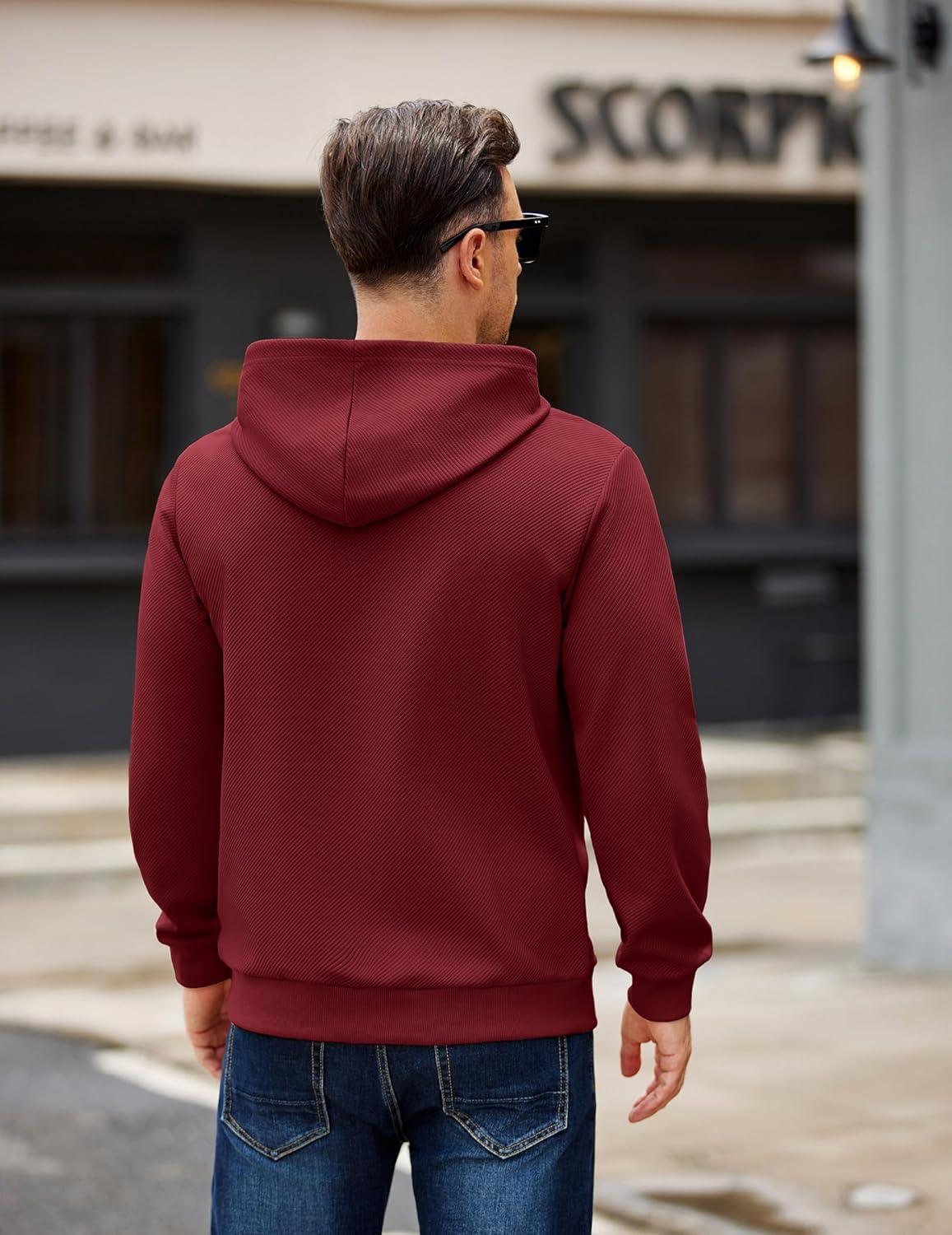 COOFANDY Men’s Long Sleeve Hooded Sweatshirt Casual Lightweight Hoodies Pullover Textured Drawstring Hoodie with Kanga Pocket(Wine Red)