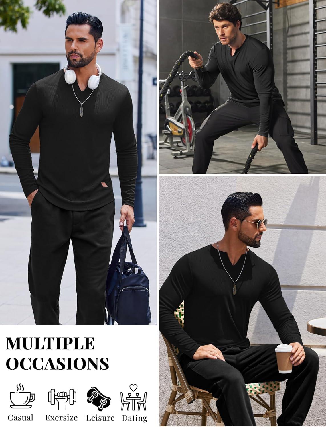 COOFANDY Men's Long Sleeve Muscle T Shirts Casual V-Neck Slim Fit Longline Ribbed Shirts Stretch Tee Shirts(All Black)
