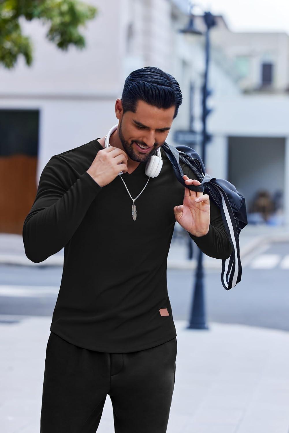 imageCOOFANDY Mens Long Sleeve Muscle T Shirts Casual VNeck Slim Fit Longline Ribbed Shirts Stretch Tee ShirtsAll Black