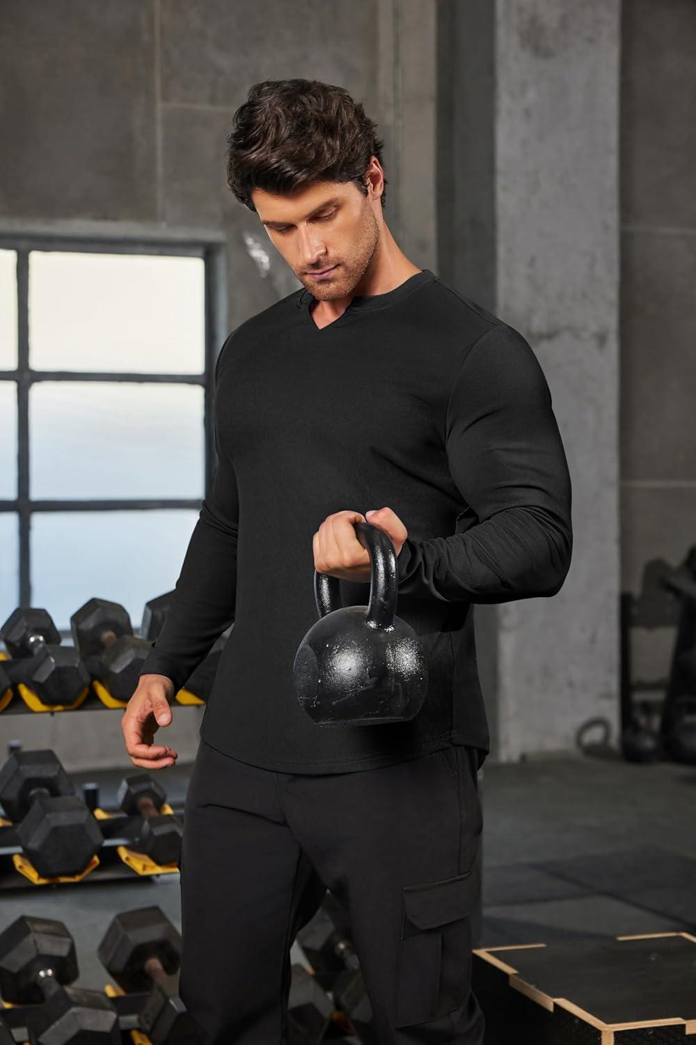 COOFANDY Men’s Long Sleeve Muscle T Shirts Casual V-Neck Slim Fit Longline Ribbed Shirts Stretch Tee Shirts(All Black)