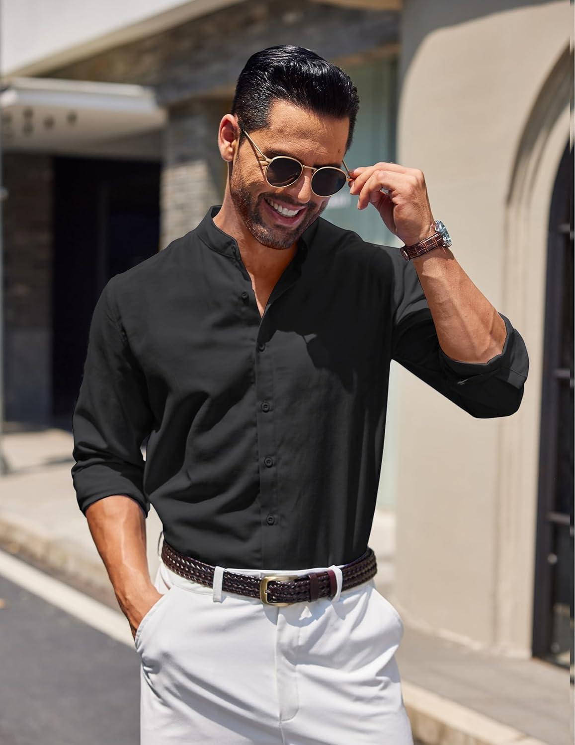 COOFANDY Men’s Long Sleeve Oxford Dress Shirts Chambray Button Down Shirt Casual Band Collar Shirts(Black)