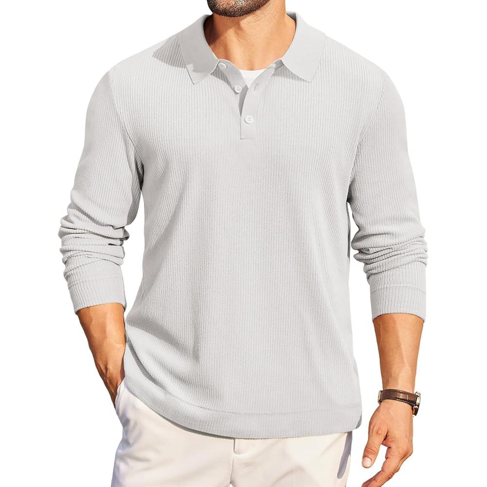 COOFANDY Mens Long Sleeve Polo Knit Polo Sweater Collared Pullover Casual Golf Polo Sweater(Moon Gray)