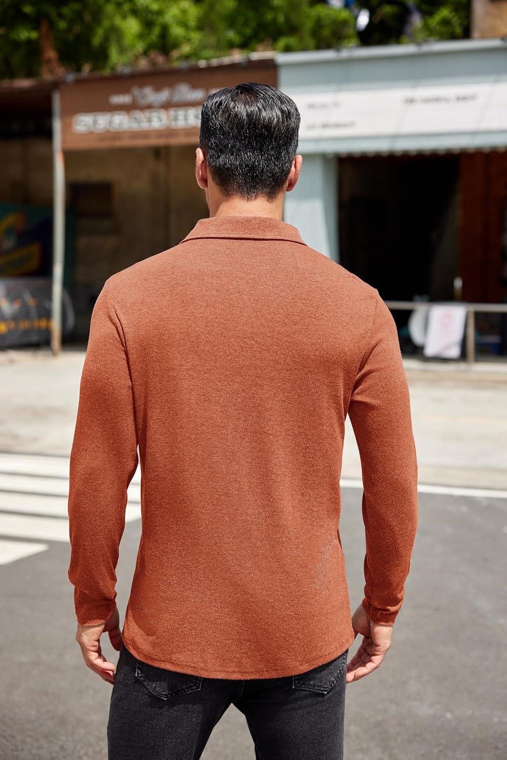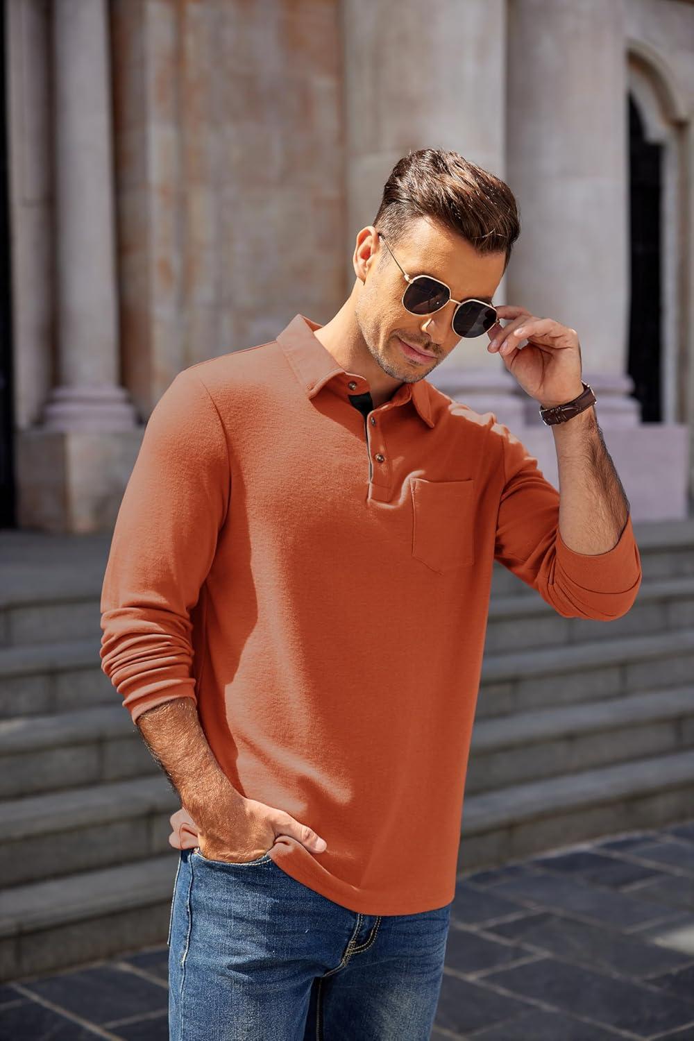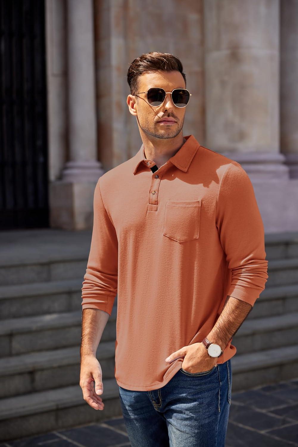 COOFANDY Men’s Long Sleeve Polo Shirt Casual Dress Button Polo T Shirt with Pocket Basic Lightweight Collared Golf Shirt(Caramel)