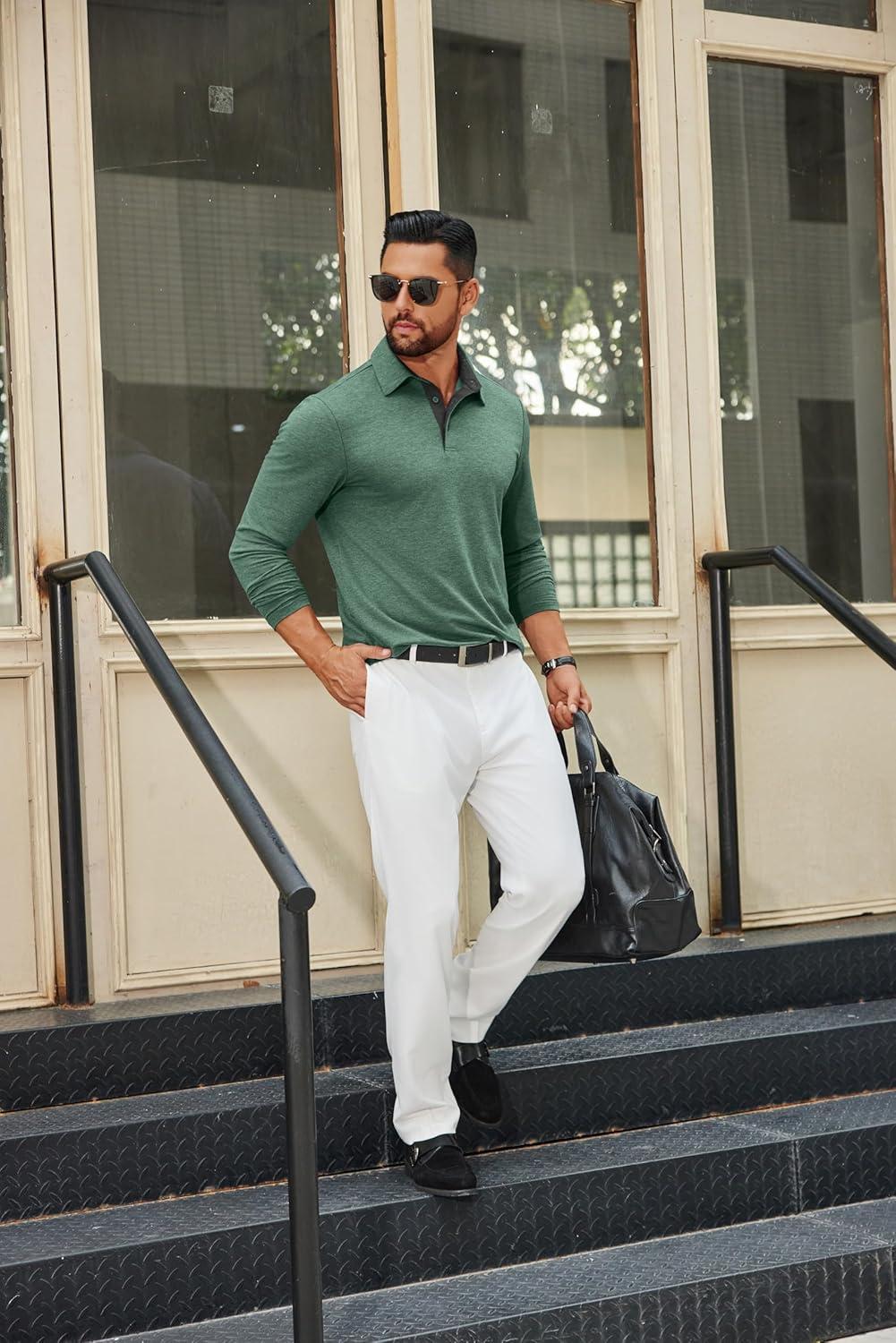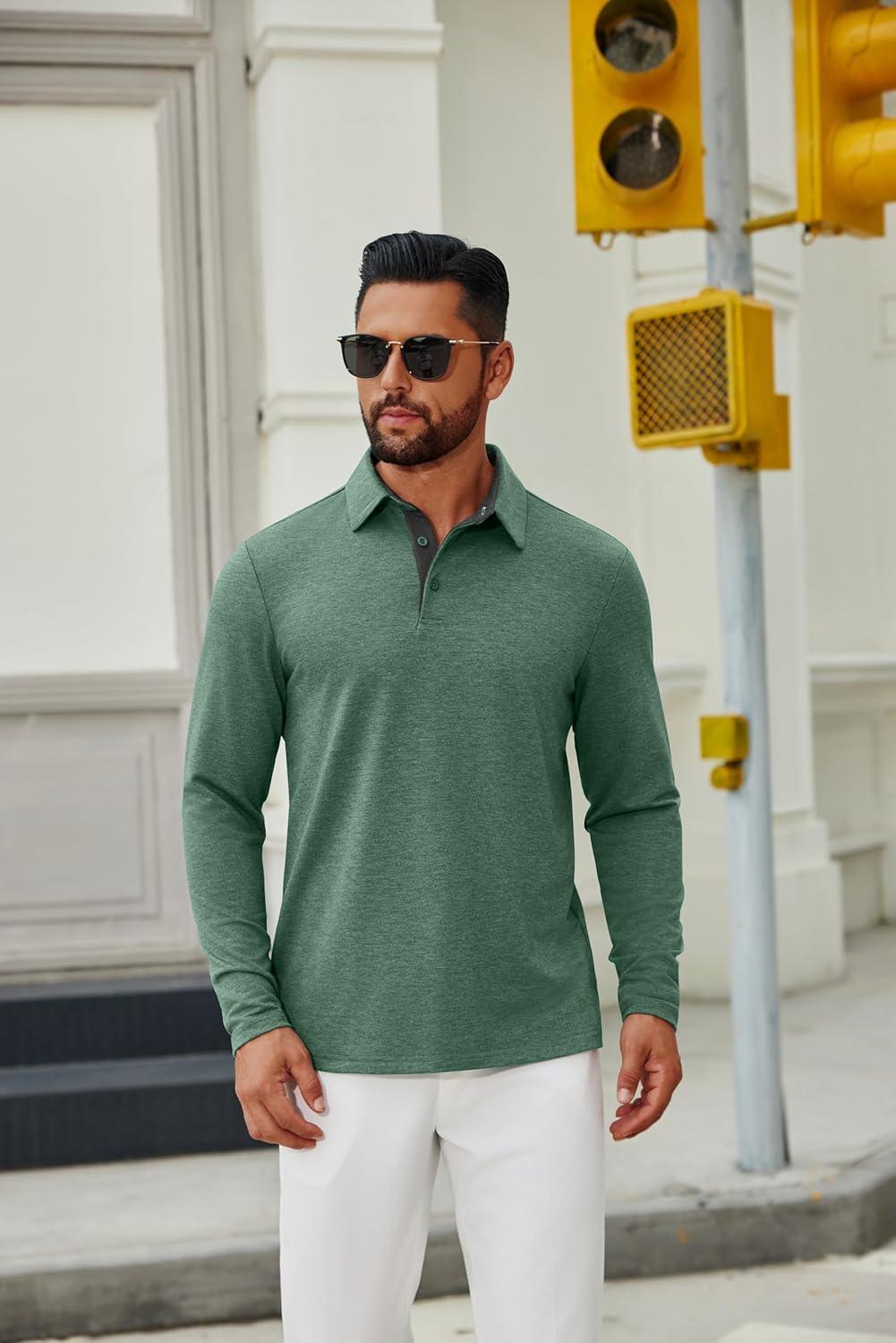 COOFANDY Mens Long Sleeve Polo Shirts Button Casual Tee Collared Work Pullover Shirts(Green)