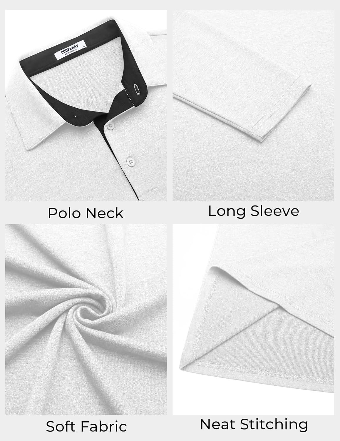 COOFANDY Mens Long Sleeve Polo Shirts Button Casual Tee Collared Work Pullover Shirts(White)