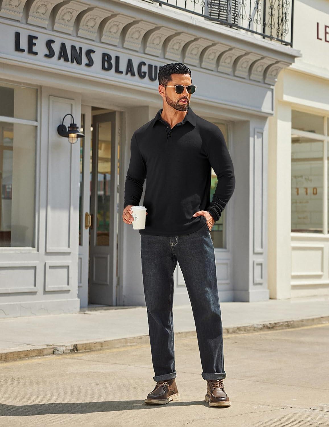 COOFANDY Mens Long Sleeve Polo Shirts Classic Casual Button Polo Tee Lightweight Collared Golf Shirt(02-black)