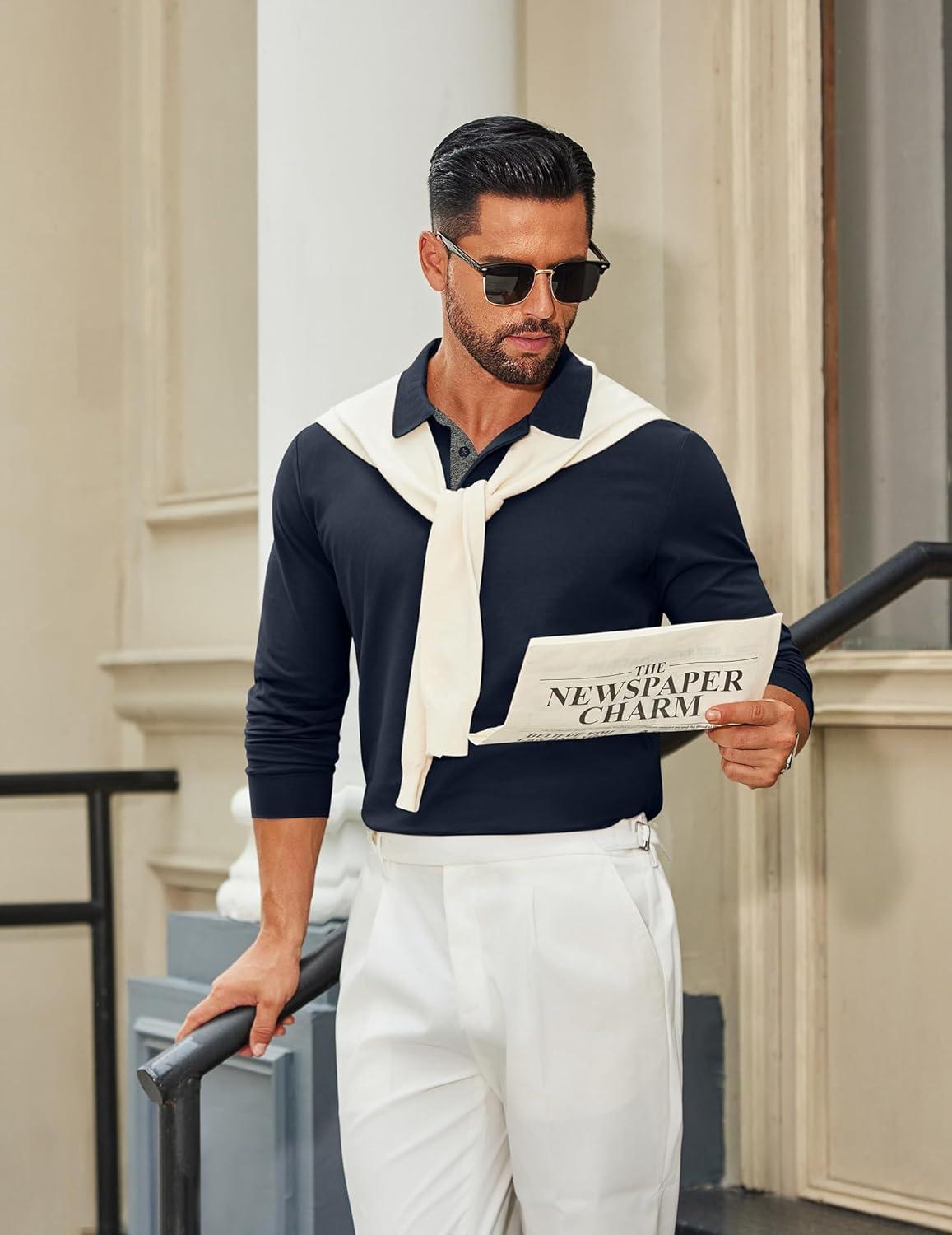 COOFANDY Mens Long Sleeve Polo Shirts Cotton Collared Shirts Casual Business Polo Classic Golf T Shirts(Navy Blue)