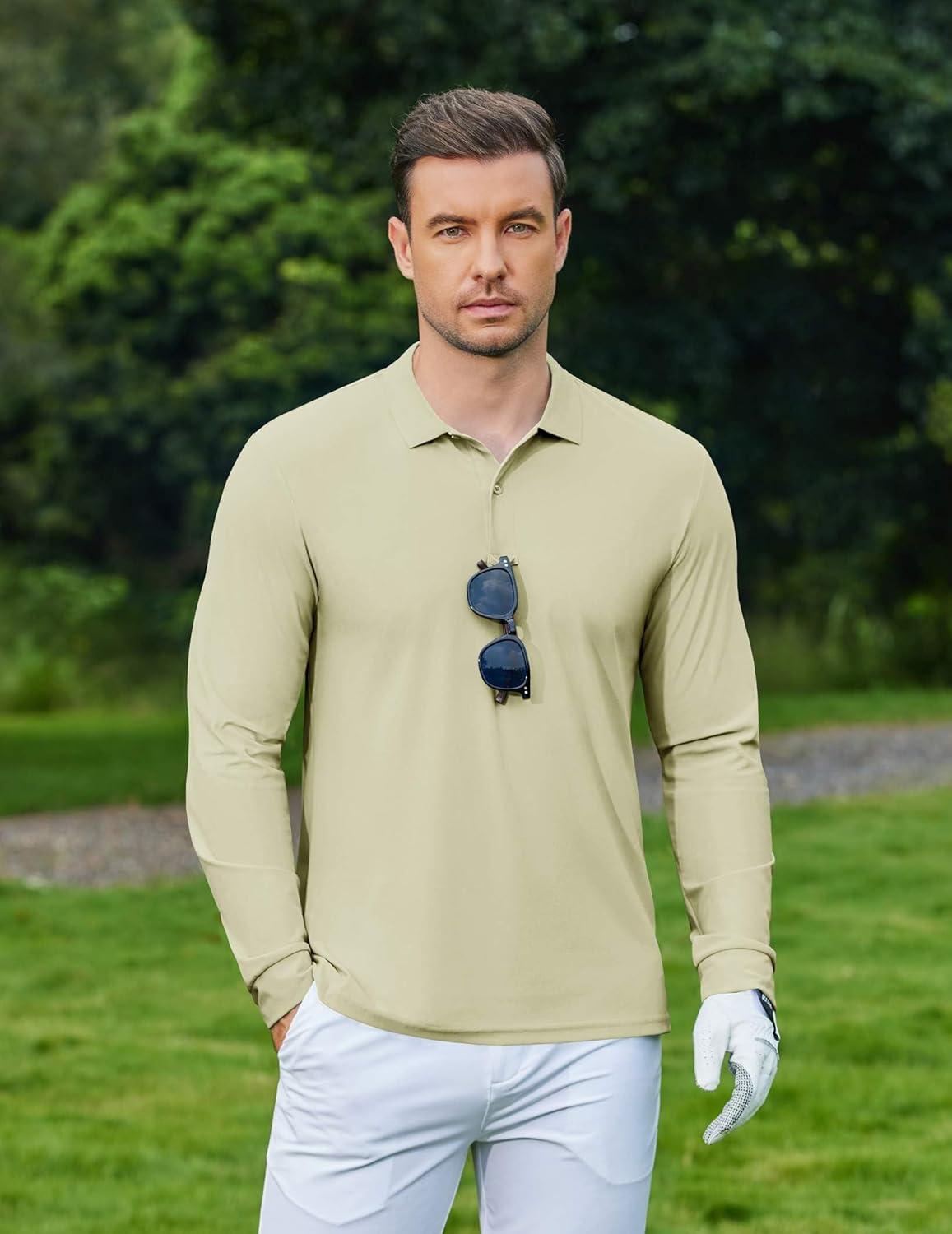 COOFANDY Men's Long Sleeve Polo Shirts Moisture Wicking Golf Shirts Athletic Collared Shirt Lightweight Cooling Shirt(Khaki)